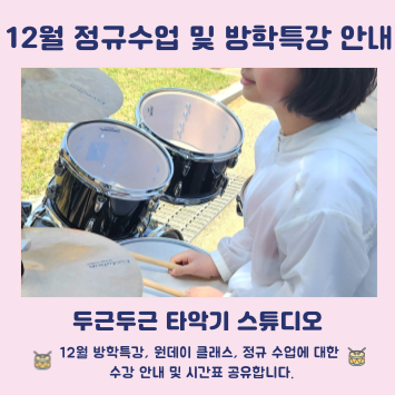 안녕하세요! 신고 제 1815호 두근두근 타악기 음악교습소입니다. 아직 연말이 마무리가 되지는 않았지만 새 해 준비 및 신학기 대비로 신규 수강생 문의가 꾸준히 오고 있어서 안내차 인사드립니다! 원데이 클래스 및 방학특강 신청 안내 1. 맨 아래 노란색 1월 오픈 시간표 확인 후 2. 원하는 과목 2가지를 고른 뒤 (드럼,마림바,우쿨렐레,텅드럼,카혼,젬베,난타,컵타,음악놀이) 3. 수강생 연령과 함께 아래 카카오 채널 상담 남기기 ! ⬇️⬇️⬇️⬇️⬇️⬇️ 정규 수업 안내 두근두근 타악기 음악 교습소의 정규 수업은 예비 7세 친구들부터 수강이 가능하며 프리미엄 수업방식으로 한 타임당 최대 2명까지만 수업을 진행합니다. (단, 음악....... <img src="https://blogthumb.pstatic.net/MjAyNTEyMDRfMyAg/MDAxNzY0ODM4NjE5ODQ4.x1IC4_ln4s0c-F_LnbLaP2oGwr_Sw0eOvSFGNf7ylAEg.xvnzeSRbEiRYoIJCdEdtvsF6XKqmnm5qyufnqVImF8kg.PNG/%C1%A6%B8%F1%C0%BB%A3%AD%C0%D4%B7%C2%C7%D8%C1%D6%BC%BC%BF%E4%A3%DF%A3%DF%A3%AD%BA%B9%BB%E7%BA%BB%A3%AD001.png?type=s3" />