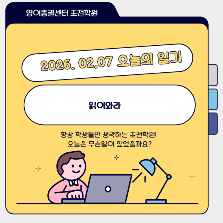 읽어와라 초전동영어학원, 영어종결센터 초전학원에서 영어를 어려워하는 학생들, 특히 고등을 앞둔 예비 고1들에게 지난 한 달 동안 내가 반복해서 한 말은 단 하나였다. “읽어와라.” 사실 읽어오는 숙제는 쓰기 숙제보다 훨씬 힘들다. 계속 소리 내어 읽다 보면 목이 아플 수도 있지만, 그보다 더 힘든 건 공부한 흔적이 눈에 남지 않는다는 점이다. 해석을 써 오거나 문제를 풀어오는 숙제는 힘들어도 결과가 남는다. 끝내고 나면 ‘뭔가 해냈다’는 보람이 있다. 하지만 읽기는 다르다. 열심히 읽어도 뭐가 달라졌는지, 내가 뭘 얻었는지 확인하기가 어렵다. 한마디로 말해, 답답하다. 그걸 너무 잘 알면서도 나는 계속 “읽어와라”라고 말....... <img src="https://blogthumb.pstatic.net/MjAyNjAyMDdfMTc0/MDAxNzcwNDA2OTcwMzg2.o30DOobrnbnwwa84WQW-weuwZr0hykpcItW_ETuirp0g.opuuch7snG2-d0ZXrMn_VqMgrrcaDDaGBeZiM-HJ9ukg.PNG/%C1%A6%B8%F1%C0%BB_%C0%D4%B7%C2%C7%D8%C1%D6%BC%BC%BF%E4_-001_%2826%29.png?type=s3" />