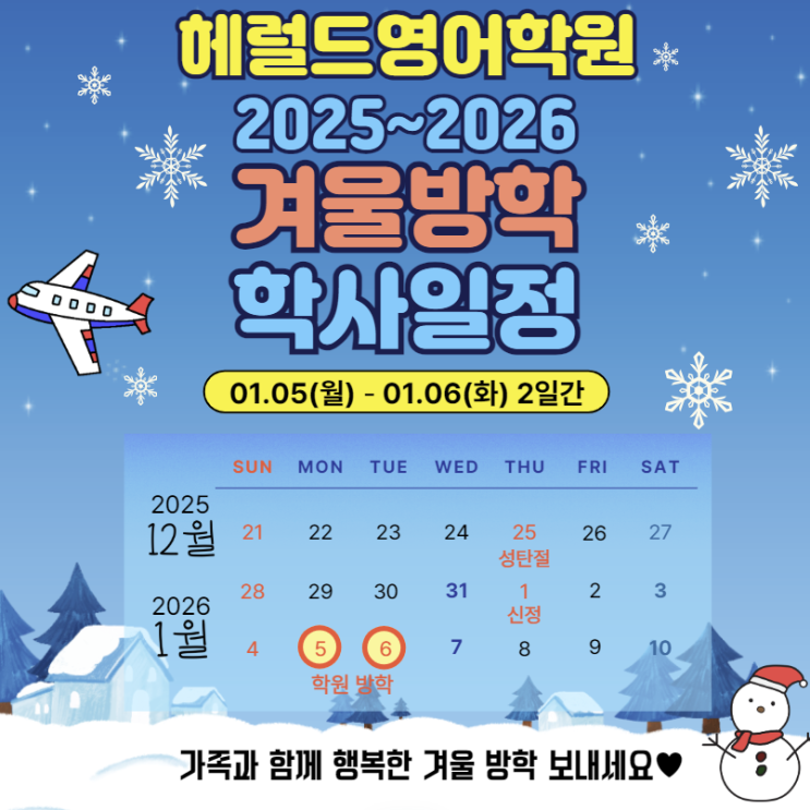 안녕하세요 헤럴드영어학원입니다. 2025 ~ 2026년 겨울방학을 공지합니다. 짧다고 생각되실 수 있지만, 저희 헤럴드 영어학원은 학생들의 발전을 최우선으로 생각하고, 겨울방학을 최소한의 날짜를 잡고 운영하고 있습니다. 짧지만 재충전하여 새로운 도약을 위해서 방학 기간 동안 힘써보도록 하겠습니다. 항상 감사합니다. #통영영어학원 #무전동영어학원 #통영초등영어 #통영중등영어 #통영고등영어 #통영영어전문학원 #통영학원 #통영수능영어 #통영영어1등 <img src="https://blogthumb.pstatic.net/MjAyNTEyMTFfMTky/MDAxNzY1NDQwMDE5MjE5.UfIJ_oMQ71zEepFv9R3iQpzKTDmQs0VmKTBucaRUJcgg.zpVuQkvQs5em1j6kFWyRT83bHstGRdJLmwjG1BB7SW4g.PNG/KakaoTalk_20251210_192709951.png?type=s3" />