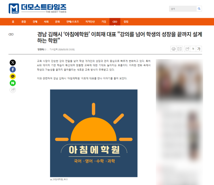 안녕하세요, 아침에학원입니다. 최근 저희 학원이 언론사 더모스트타임즈에 소개되었습니다. 이번 기사에서는 기존의 단순 강의 중심 학원이 아닌, 학생의 성장과 관리에 집중하는 교육 시스템을 운영하는 학원으로 다뤄졌습니다. 아침에학원은 학생 개개인의 학습 데이터를 기반으로 ✔ AI 분석 ✔ 맞춤형 학습 설계 ✔ 지속적인 관리 를 통해 학생마다 다른 수준과 속도에 맞는 교육을 진행하고 있습니다. 또한 ✔ 과목별 맞춤 학습 시스템 ✔ 수업 녹화 및 복습 지원 ✔ 질문·답변 관리 시스템 을 통해 학생들이 혼자 공부하는 것이 아니라 끝까지 관리받는 학습 환경을 제공합니다. 아침에학원이 추구하는 방향은 명확합니다. ....... <img src="https://blogthumb.pstatic.net/MjAyNjAzMzFfMjk4/MDAxNzc0OTYxOTM4Nzk3.rYG82BP5FmuCpn-eRNZgui1figPB_m-jxDHAp5wtbakg.Ku_mbkuOIQ40jU1ft__q4adNB65GaGzoaQ7A1WXlSMUg.PNG/image.png?type=s3" />