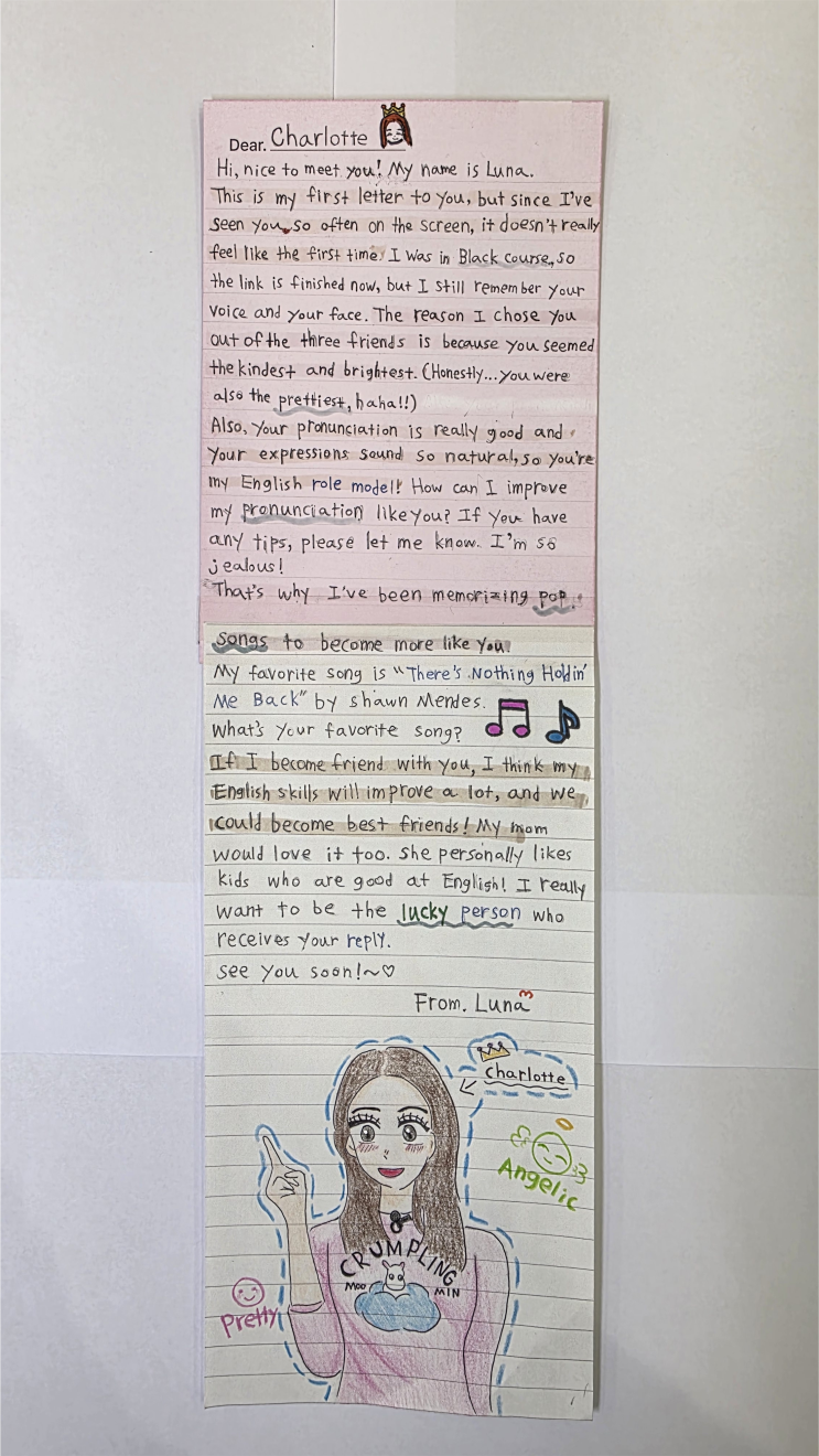 2026년 신학기 [미션 편지쓰기] 이벤트가 많은 회원분들의 적극적인 참여로 성황리에 마무리되었습니다❣️ 그간 몇 천장에 육박하는 아이들의 편지를 하나하나 꼼꼼히 살펴보며, 정성스럽고 솔직한 편지를 선정하기 위해 심사에 만전을 기했는데요..! 화면 너머로만 만나던 원어민 친구들임에도, Link를 하면서 샬롯과 제이나, 제레미를 정말 친구처럼 느껴왔던 뮤엠영어 아이들의 따스한 마음이 차곡차곡 느껴지는 감동 가득한 시간이었답니다 그렇다면, 뮤엠영어 아이들이 Link의 원어민 친구들에게 궁금했던 게 무엇인지, 어떤 말을 전하고 싶었는지!! 여러분들께 공유해드리지 않을 수가 없겠죠! 치열한 심사를 거쳐 선발된 수상작들을....... <img src="https://blogthumb.pstatic.net/MjAyNjAzMzFfMzYg/MDAxNzc0OTM5NzQyMTU3.uVHb6VqMAreXfWFJOVxTc2LckfGkU7wXkwHLG20JZPMg.vcY4RcpIFfhmUYKnUF2F1uoCCqS9lWKMVT0lbCe5ofsg.PNG/image.png?type=s3" />