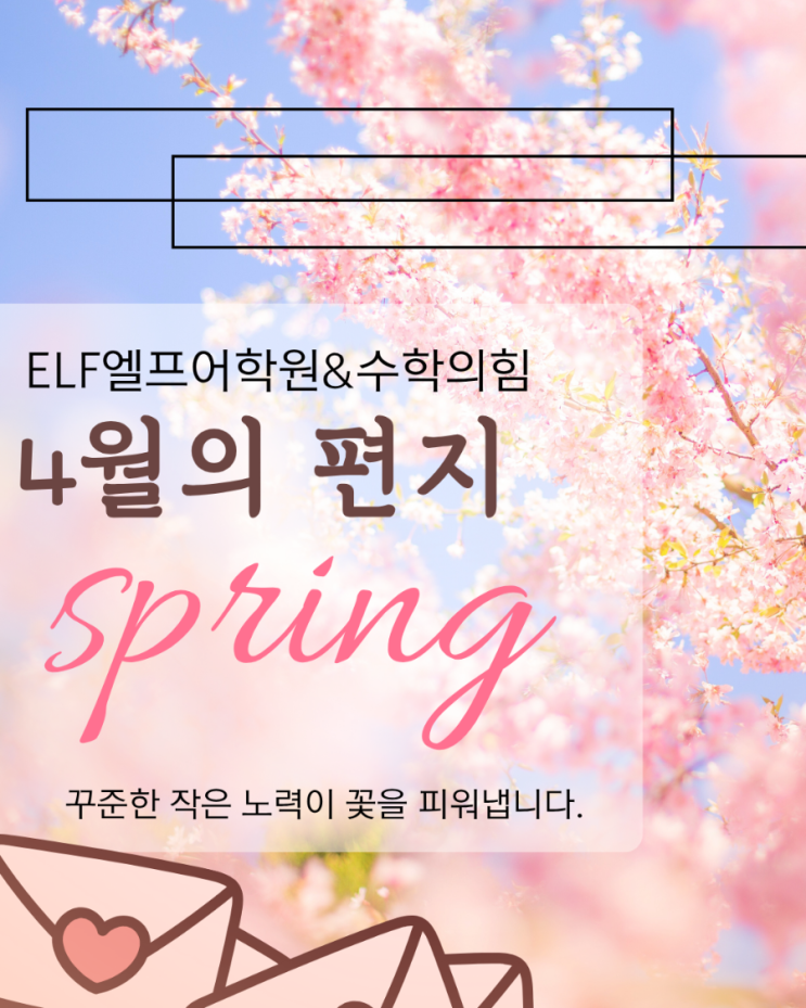 안녕하세요. 율하 엘프어학원 & 수학의힘 원장 류경화입니다 벚꽃이 아름답게 피는 봄, 아이들의 새로운 시작과 함께 4월이 찾아왔습니다. 이번주 토요일 중간고사 대비 공부하러 학원으로 등원 할~^^ 귀염이 ㅋㅋ 중·고등 학생들이 엘프&수학의힘에는 아~주~ 많이 있답니다 오늘 출근길, 요 귀염이 중학생들을 위한 (꿀떡과 백설기)을 주문하러 가는 길에ㅋㅋ 봄이 성큼 다가왔음을 ... 벚꽃을 가득가득 느끼며 걸었습니다 ㅎㅎ 이처럼 계절이 바뀌는 시기는, 아이들에게는 학습의 방향을 잡는 중요한 시기이기도 합니다. 엘프어학원 & 수학의힘은 아이들이 단순히 점수를 위한 공부가 아니라 꾸준히 공부하는 습관을 만들고 자신의....... <img src="https://blogthumb.pstatic.net/MjAyNjA0MDFfMTk4/MDAxNzc1MDM3MDk4NTMx.6V1G6PmADo-430wZ0nYch7Kp4TSYAqas5itV_OmO5CIg.wp3AVscxjAsqtCAfkuuSyarFYyI07Xvba8RcMrSrbE0g.PNG/900%A3%DF1774942332028.png?type=s3" />