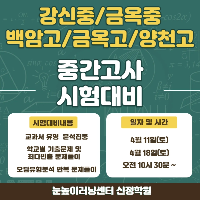 안녕하세요! 눈높이러닝센터 신정학원입니다. 4월 중간고사를 앞두고 우리 센터에서는 중학생, 고등학생 대상 시험대비 프로그램을 본격적으로 진행하고 있습니다. 학교시험은 단순히 문제를 많이 푸는 것보다 학교별 출제 경향을 파악하고 자주 틀리는 유형을 반복 정리하는 과정이 훨씬 중요합니다. 그래서 눈높이러닝센터 신정학원에서는 학생들이 실제 시험장에서 더 안정적으로 실력을 발휘할 수 있도록 학교 맞춤형 시험대비 과정을 준비하고 있습니다. 1.학교별 맞춤 시험대비로 진행합니다. 이번 시험대비는 강신중 / 금옥중 / 백암고/ 금옥고/ 양천고 학생들을 중심으로 학교별 진도와 시험 범위에 맞추어 운영됩니다. 2.교과서 유형분....... <img src="https://blogthumb.pstatic.net/MjAyNjA0MDFfMjc4/MDAxNzc1MDMxNjg0NTI3.H8HSfJQ29A9fALTuLAwZW4xi2yrAOF6JxsJeGyArjuwg.ecCQlsYXUdUAovZ19xJlMq1zzGEZ3sd6GeZA80jbn-cg.JPEG/%C1%DF%B0%A3%B0%ED%BB%E7%C0%CF%C1%A4.jpg?type=s3" />
