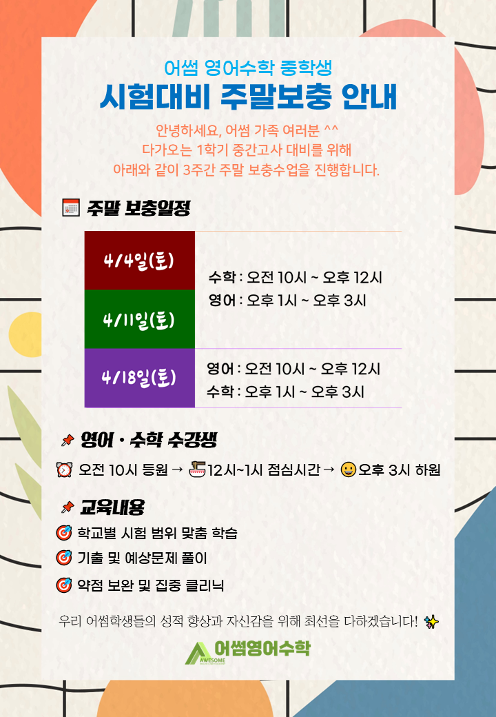 [어썸 영어수학 중등부 중간고사 대비 주말 보충 안내] 안녕하세요, 어썸 가족 여러분! ^^ 어느덧 1학기 중간고사가 코앞으로 다가왔습니다. 우리 아이들이 노력한 만큼 최고의 결실을 맺을 수 있도록, 아래와 같이 3주간 주말 보충 수업을 진행합니다. 특히 시험 직전인 4월 18일(토)은 영어 보충 시간이 오전으로 변경되었으니, 일정 확인에 각별히 유의 부탁드립니다. 주말 보충 상세 일정 1. 4월 4일(토) & 4월 11일(토) 수학: 오전 10시 ~ 오후 12시 영어: 오후 1시 ~ 오후 3시 2. 4월 18일(토) ★시험 직전 보충★ 영어: 오전 10시 ~ 오후 12시 (시간 변경 주의!) 수학: 오후 1시 ~ 오후 3시 원장님 전달 사항 4월 18일(토) ....... <img src="https://blogthumb.pstatic.net/MjAyNjAzMzFfOTMg/MDAxNzc0OTU0NDYyMDA4.c4FMQf_Tj9pAhV72lho_7dziLxZ5zEem0TAIaHzEkA4g.iwWmVgjWauBXKjSKSPZPEtV_3ii4WthONqV25si3Xr0g.PNG/1774953603012.png?type=s3" />
