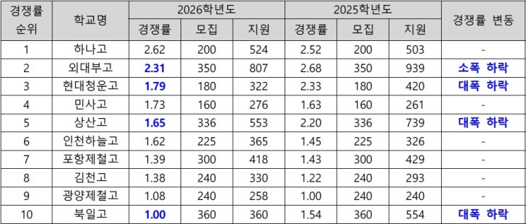 2026학년도 전국 자사고 경쟁률 정리 & 분석 안녕하세요 와이즈만 서초센터입니다^^ 12월 12일 금요일, 전국 단위 자사고의 원서접수가 마감되었습니다. 자녀의 자사고 진학에 관심 있으신 학부모님은 이번 경쟁률 정리글을 통해 앞으로의 경쟁률과 학교 선택, 그 이후 대학교 입시까지 이어지는 과정에 대해 생각해보시기 바랍니다. < 2026학년도 전국 단위 자사고 > 경쟁률 총정리 1. 2026학년도 전국 단위 자사고 경쟁률 요약 전체 모집 인원은 작년과 동일한 2,591명에 4,213명이 지원하여 경쟁률은 <1.63:1>로 작년 <1.82:1> 대비 감소했습니다. 작년에 이어 전체 경쟁률이 하락하고 있는데, 특히 상산고, 현대청운고....... <img src="https://blogthumb.pstatic.net/MjAyNTEyMjBfMTIx/MDAxNzY2MTkyMDk0MDkz.MfSIGsJ21FhhDWnD3UHHd7Ey0dqz9J6wiPxWaBNR5H8g.zKHbubKDuyYKEuBOFir-kKIhaagohkUImH4xcO_0h5Qg.JPEG/1.%B0%E6%C0%EF%B7%FC%BC%F8%C0%A7_%C7%A5.jpg?type=s3" />