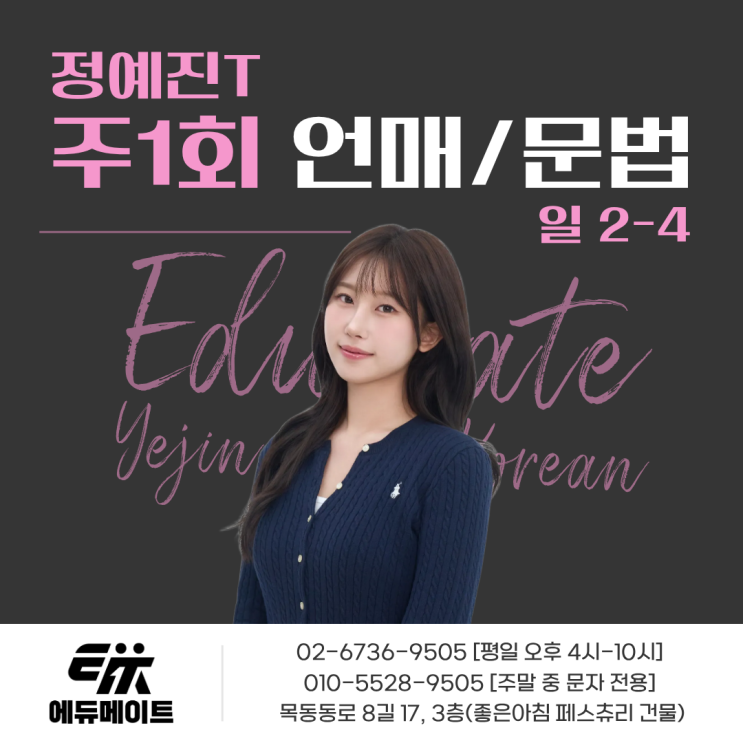 안녕하세요. 목동 소수정예 관리형 학원, 에듀메이트 학원입니다. 많은 학생이 국어 영역에서 '언어와 매체(문법)' 파트를 까다로워합니다. 개념을 익혔다 생각해도 막상 실전 문제를 마주하면 적용이 안 되거나, 시간이 부족해 실수하는 경우도 많죠...ㅠ.ㅠ 이에 에듀메이트 학원에서는 목동 지역 학생들의 완벽한 국어 문법 정복을 위해!!! 수능 국어 전문 정예진T의 '수능문법반'을 개설했습니다~~ [강좌 상세 안내] 담당 강사: 정예진 선생님 강좌명: 국어문법반 시간: 매주 일요일 오후 2시 ~ 4시 1. '기초'와 '실전'을 동시에 잡는 효율적인 커리큘럼 주1회, 2시간이라는 한정된 시간을 최대한 효....... <img src="https://blogthumb.pstatic.net/MjAyNjA0MDNfMTEg/MDAxNzc1MjAzOTUxMzY5._9UJq11GBRnSXbKYoiZgdljpNX7e_V4NmxHNH9whySsg.F8DngEHzt3KTlxlZaM2l-RwlHpOTkXFz-sojwwn-FQEg.PNG/4%BF%F9-2.png?type=s3" />