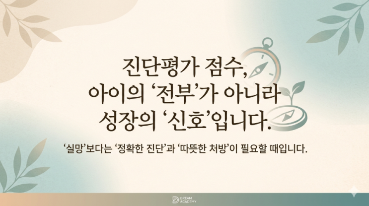 어느덧 새 학기가 시작되고, 학원이나 학교에서 치른 진단평가 결과지를 받아보셨을 시기입니다. 기대 반 설렘 반으로 펼쳐본 결과지. 하지만 예상보다 낮은 점수나 '기초 부족'이라는 단어를 마주했을 때, 부모님의 마음은 복잡해집니다. 화가 나기도 하고, 한편으론 미안하기도 하며, "지금껏 내가 뭘 놓친 걸까?" 하는 자책감에 빠지기도 하시죠. 하지만 원장으로서 수많은 아이를 지켜봐 온 제가 감히 말씀드립니다. 어머니, 지금의 이 '충격'이 아이에게는 가장 큰 '행운'이 될 수 있습니다. ### 1. "모르는 것을 아는 것"이 공부의 시작입니다 가장 위험한 공부는 '아는 척'하....... <img src="https://blogthumb.pstatic.net/MjAyNjAzMzFfMjgz/MDAxNzc0OTYzMzM2NTA2.ECVDCdTCwrXkdXry45QSAZimP7ZYIu2SD0ewMEL4uz0g.mED5iZ0t5wcHNtzlWyaZGskMqErY4HNnP2JktiM05_Ig.PNG/900%A3%DF1774962634620.png?type=s3" />
