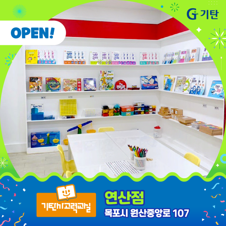 안녕하세요. 유치, 초1·2·3 전문 교육기관 기탄사고력교실입니다. 오늘은 목포시 연산동 기탄공부방이 새롭게 문을 열었다는 반가운 소식을 전해드립니다. 연산동 인근 아이들이 더욱 체계적이고 즐겁게 학습할 수 있는 공간이 마련되었으니 많은 관심 부탁드립니다. 화이트 톤이 주는 안정감, 노란색 포인트가 더하는 활력 연산동 기탄공부방은 전체적으로 화이트 톤의 책상과 벽면 디자인으로 구성되어 있어 공간이 깔끔하고 환하게 느껴집니다. 밝은 조명과 맞춰진 화이트 톤 책상은 아이들이 산만함을 줄이고 차분하게 앉아 학습에 집중할 수 있는 환경을 만들어 줍니다. 포인트처럼 배치된 노란색 의자는 공간에 생동감을 더하며, 아이들에....... <img src="https://blogthumb.pstatic.net/MjAyNjAxMjNfMTA5/MDAxNzY5MTU4NjE4Nzkz.F76ObcoWT6lW1RN0CFQWXRTWDVx8erI5-_U71vyCIjkg.RLO7FL64B1CYV8rP8mpOkD7pJ1cXUTtn4Aj27P3BXbsg.PNG/2601_17_%C1%A4%B9%E6%C7%FC_%BF%AC%BB%EA%C1%A1.png?type=s3" />