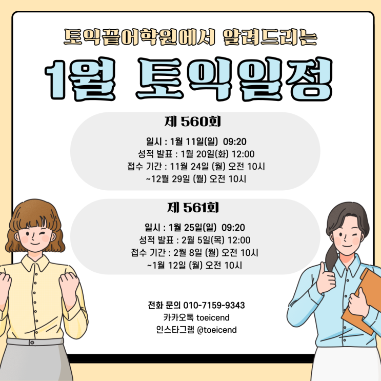 안녕하세요 #토익끝어학원 입니다 :-) 다가오는 2026년, 새로운 해를 맞이 할 준비 하고계신가요~? 2026년의 토익끝어학원은 여러분의 #토익 고득점을 위해 열심히 달릴 준비하고있답니다 ❤️오늘은 2026년 1월의 토익 일정을 소개해드리겠습니다!❤️ ✔️560회 일시 : 1월 11일 성적 발표 : 1월 20일 접수 기간 : 11월 24일 ~ 12월 29일 ✔️561회 일시 : 1월 25일 성적 발표 : 2월 5일 접수 기간 : 12월 15일 ~ 1월 12일 토익끝어학원에서는 영어를 두려워하는 분부터 고득점을 바라는 분들까지 다양한 커리큘럼이 준비되어있습니다! 여러분의 곁에서 항상 준비되어있는 토익끝어학원입니다 ☎️ 010-7159-9343 제....... <img src="https://blogthumb.pstatic.net/MjAyNTEyMTBfMjg1/MDAxNzY1MzQxNjQzNDI1.D-f6S3yEdgBzW2ivUHKGd_MOezJkAFuohC6rAxCSS-Ig.kj5YSTWtJr2AgiGhfzax-8qm5gQiSQn4aNBHFysm2nwg.PNG/22_11%BF%F9-%C5%E4%C0%CD%C0%CF%C1%A4_%B1%E2%BA%BBver__-001.png?type=s3" />