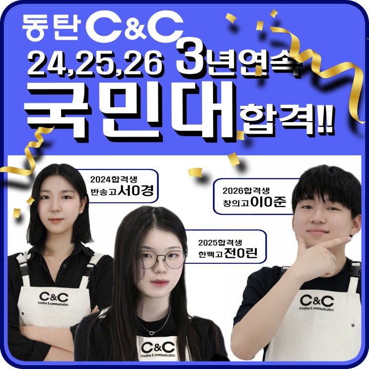 안녕하세요. 2동탄씨앤씨미술학원입니다. 오늘은 저희 2동탄씨앤씨 입시반의 국민대학교 합격생 소식을 전해 드리겠습니다. 동탄씨앤씨미술학원 "2024,2025,2026 3년 연속 국민대학교"합격!! 저희 2동탄씨앤씨미술학원 입시반은 2024,2025학년도에 이어 2026학년도에도 국민대학교 합격생을 배출하게 되었습니다. 동탄입시미술학원으로써는 유일하게 3년 연속 국민대학교 합격생을 배출하고 있는데요. 특히 2동탄 지역의 한백고와 창의고에서 합격생들이 나오고 있어 저로써도 더없이 기쁜 소식이기도 합니다. 그럼 지금부터 영광의 주인공들을 한 명씩 소개하면서 다가오는 2027학년도 국민대학교 입시전형도 함께 살펴보도록 하겠습....... <img src="https://blogthumb.pstatic.net/MjAyNjAyMTlfNDYg/MDAxNzcxNDc2NTMxMjM3.9RM7GsQjGc82ervvNCp4ew1je8qRS9MtoErYHs5zSh0g.1d8HNF_at1amOlJWFgDoytiNDEI2es_kRBaQvDFCTX8g.JPEG/%B5%BF%C5%BA%C0%D4%BD%C3%B9%CC%BC%FA%C7%D0%BF%F8.jpg?type=s3" />
