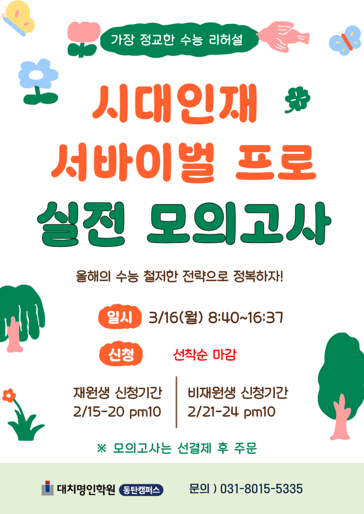 수능 직전 실전감각을 키우는 최적의 훈련, 가장 평가원적인 시대인재 모의고사를 동탄대치명인에서 서바이벌 모의고사란? 시대인재가 주관하는 극상위권 대상 실전형 모의고사 일반 사설 모의고사보다 난이도 높고, 변별력이 뛰어남 수능 출제진 출신 구성원이 직접 문항 제작 어떤 학생에게 필요할까요? 교육청과 기존 사설모의고사로 실전감각이 부족한 학생과 상위 1등급 내에서도 실수를 줄이고 싶은 학생 서바이벌 프로 모의고사 시간표 < 수능과 동일 > 1교시 국어 08:40~10:00 2교시 수학 10:30~12:10 3교시 영어 13:10~14:20 4교시 한국사 및 탐구 14:50~16:37 신청 마감일 (신청인원에 따라 조기 마감될 수....... <img src="https://blogthumb.pstatic.net/MjAyNjAyMjBfMTMw/MDAxNzcxNTg3NzY2MzU0.UmN3PPzKhUJJckHgbeAfm0fwn67nLYg6X0sx6tBzQ6Qg.QEFbJVa-klPGdVakSZrXML3Zba35EhYDZx3aGGPUAvsg.PNG/%BC%AD%B9%D9%C0%CC%B9%FA_%C7%C1%B7%CE_%BD%C5%C3%BB.png?type=s3" />