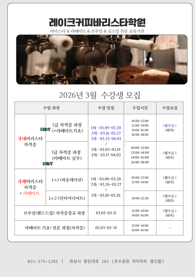 2026년 동탄레이크커피바리스타학원 "3월" 수강생 모집