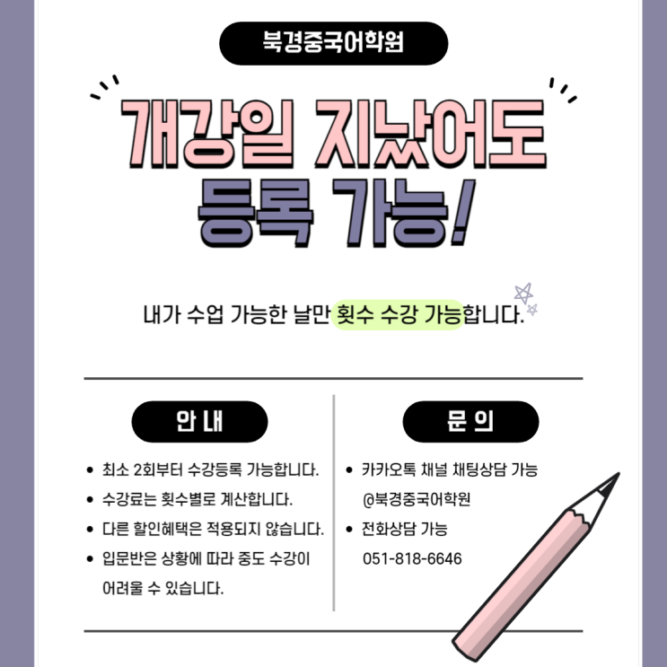 부산 서면 중국어 전문학원 북경중국어학원입니다 지금도 4월 수업 등록 가능합니다! 내가 수업 가능한 날만 횟수 수강 가능! *입문반(중국어가 처음이신 분)의 경우 중도에 수강이 불가능할 수 있습니다 카톡채널이나 전화로 문의해 주시면 개설된 수업에 등록 가능한지 안내해 드리겠습니다 :) ▼ 카카오톡 채널 ▼ 인스타그램 <img src="https://blogthumb.pstatic.net/MjAyNjA0MDdfMTg4/MDAxNzc1NTMwNzgyODcw.41JtNaK9MOb0Gn7FxqyQwIRLY6IB614En1bWa2D3G4og.SPlPHOsrA8z7DLIQ5-jN1pafi_hobPlXHv_mpmi-whwg.PNG/4%BF%F9%C0%DA%C0%B2%BC%F6%B0%AD%C1%A6.png?type=s3" />