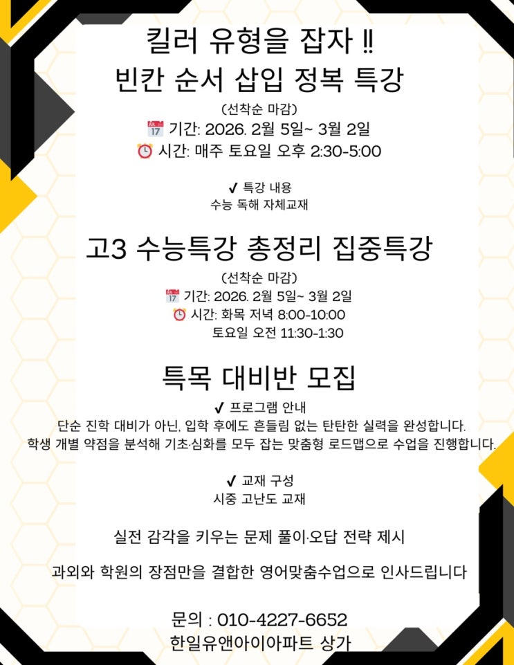 안녕하세요. 초심프리미엄영수학원입니다. 기말고사가 끝나고 방학이 시작된 지도 어느덧 3주가 되어갑니다. 추워진 날씨만큼이나 본원에도 여러 변화가 있어 학부모님들과 학생 여러분께 안내드립니다. 이번 겨울방학을 맞아 본원은 학습 환경 개선을 위해 인테리어 리뉴얼을 진행하였으며, 이를 바탕으로 오전 8시부터 저녁 9시까지 운영되는 관리형 독서실 프로그램을 새롭게 개설하였습니다. 단순한 독서실 운영이 아닌, 매일 오전 8시 등원 및 단어시험 모의고사 및 맞춤형 수업 진행 전용 자리 배정(개인 파티션 및 독서등 구비) 학습 외 스마트기기(휴대전화 등) 보관 시스템 담당 선생님의 상주 및 학습 분위기 관리 를 통해 철저한 학습....... <img src="https://blogthumb.pstatic.net/MjAyNjAxMjBfMTg2/MDAxNzY4ODg3NTcyNjgx.dJejeV1LQEg39qAtAt9KEb3ZeI4ACkydHEzcmrqNlpEg.fwEOdsH11LIUy8BoIaI7vet5izHSqfe8BqfJKaM7A2cg.JPEG/KakaoTalk_20260120_143812727.jpg?type=s3" />