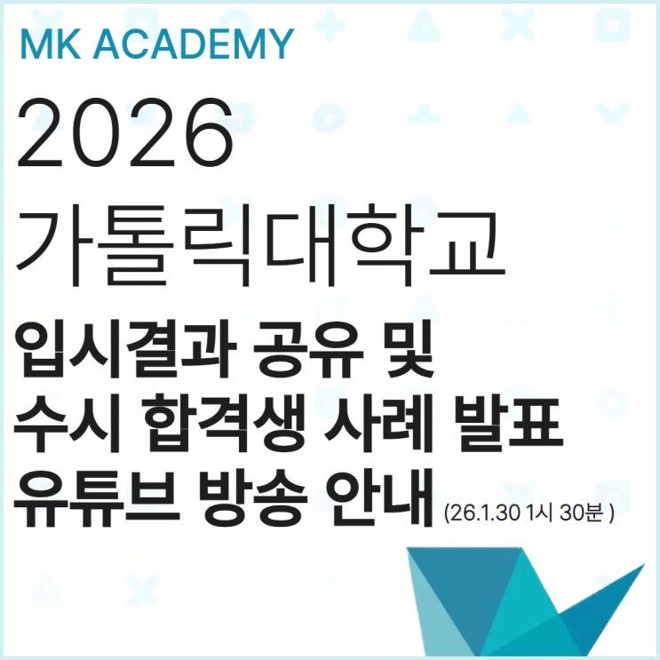 안녕하세요? MK아카데미입니다. 2026학년도 대입을 준비하는 과정에서 가장 궁금한 부분 중 하나는 실제 입시 결과와 합격 사례입니다. 단순한 모집요강이나 전형 설명이 아니라, 어떤 흐름으로 지원이 이루어졌고 어떤 준비가 도움이 되었는지를 확인하는 것이 중요합니다. 이와 관련해 가톨릭대학교에서 진행한 2026 가톨릭대학교 입시결과 공유 세미나 & 수시 합격생 웰컴파티가 유튜브 라이브 방송으로 공개되어, 관심 있는 수험생과 학부모에게 참고 자료로 활용할 수 있어 소개드립니다. 이번 방송은 입시 결과 분석부터 전공별 합격 사례, 대학생활 전반에 대한 질의응답까지 한 자리에서 확인할 수 있도록 구성된 것이 특징입니다. 행....... <img src="https://blogthumb.pstatic.net/MjAyNjAxMzBfMTg0/MDAxNzY5NzUzNjAwNjA0.iWLCIsXkAA9w6qVng7vOPz06B7MHrYqQqUePxlly1OMg.XRpzmfuR92nwHpLCxmwwgDJKnpGGFkUq2xbmLkSfmiAg.JPEG/%B1%B3%C0%B0%C1%A4%BA%B8_%2867%29.jpg?type=s3" />