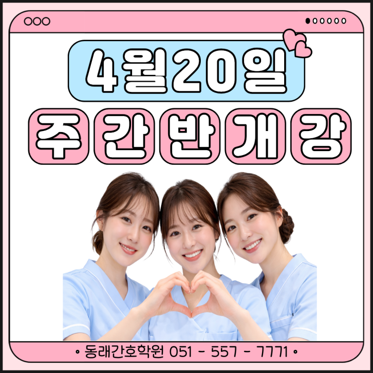 안녕하세요~ 동래간호학원입니다 오늘은 따뜻한 봄날 " 4월 20일 " 개강하는 주간반 포스팅입니다 간호조무사를 희망하는 많은 분들이 학원을 찾아주시는데요~ 동래간호학원은 우수한 강사진 간호 교육의 질은 가르치는 사람의 역량이 중요합니다. 오랜 실무 경력을 갖춘 베테랑 간호사 출신 강사진의 구성으로 단순암기가 아닌, 현장의 생생한 노하우를 녹여낸 강의를 제공합니다! 쾌적한 환경 매일 철저한 위생관리와, 환기로 항상 청결한 상태를 유지하며 학원 입구부터 강의실 내부까지 밝고 화사한 분위기에서 공부할 수 있습니다 이번 기수부터 리모델링 된 교실에서 첫 수업을 시작하게 되는데요! 쾌적한 환경에서 수업....... <img src="https://blogthumb.pstatic.net/MjAyNjAzMTRfMTU0/MDAxNzczNDg5NTM4MTc4.fLE8l5HK8pAUNl4hXF3EabUK303HYi_RZgW-6uhMHJwg.RN_UCt3Clk7YlTToz65J135icRrTLBH0Kqv_FiKQNKIg.PNG/3423.png?type=s3" />