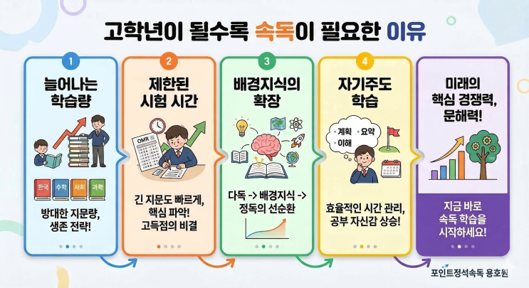 초등 고학년으로 올라갈수록 학부모님들의 가장 큰 고민 중 하나는 바로 '늘어나는 학습량'과 '어려워지는 지문'입니다. 저학년 때는 책 읽는 즐거움에 집중했다면, 고학년부터는 제한된 시간 내에 핵심을 파악하는 '전략적 독서'가 생존 전략이 됩니다. 고학년 아이들에게 왜 속독과 정독의 조화가 필수적일까요? 포인트의 직관독해 훈련은 정독 기반의 속독 훈련입니다. 독해력과 사고력을 제한 시간내 정확하고 빠르게 파악하는 것도 훈련이 필요합니다. 1. 폭발적으로 늘어나는 '텍스트의 양' 고학년 교과서를 펼쳐보면 저학년 때와는 비교할 수 없을 정도로 글자 수가 많아집니다. 국어뿐만 아니라....... <img src="https://blogthumb.pstatic.net/MjAyNjAzMTlfMjc1/MDAxNzczOTExMzc2OTc0.GirWvX3gjf5cCAHvCg2aXqXcyK71HYDpnlwj7SGwB48g.kY08gZ5s80oLAFoCKyQNFvr4tjB9sfzSc0JfLn2NtUEg.PNG/Gemini_Generated_Image_xityrdxityrdxity.png?type=s3" />