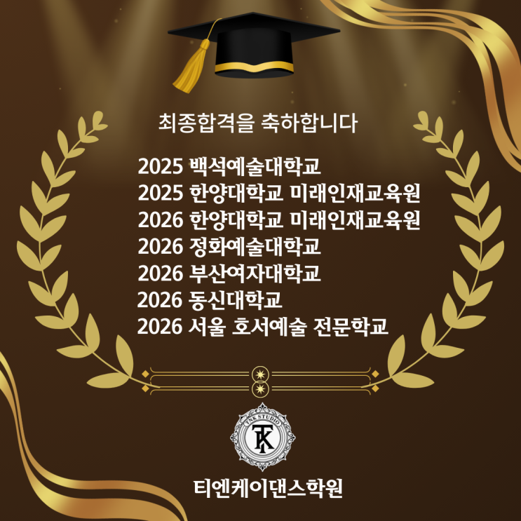 #화명동댄스학원 #화명동전문댄스학원 #화명동취미댄스학원 #화명동취미댄스반 #부산댄스학원 #부산입시댄스학원 #입시합격 #입시합격률 #백석대학교 #정화대학교 전문반 인원마감시 등록제한 2026 엄청난 경쟁률을 뚫고 최종합격을 이루다. 즐거움과 성장 두마리 토끼를 잡은 부산을 대표하는 ▶티엔케이댄스학원 2026 입시 고민 걱정은 혼자할 이유가 없습니다. ▶1년간의 노력의 보답은 내가 원하는 대학교 합격 2026년도 입시생이 많은 만큼 경쟁률도 엄청난 상황입니다. 티엔케이 입생생들 모두 입시 최종합격을 하였습니다. 티엔케이 댄스학원의 가장큰 장점 중 하나 수강생 한명한명 지도를 받을 수 있는 만큼 노력의 결과가 매우 좋은편....... <img src="https://blogthumb.pstatic.net/MjAyNTEyMDFfNTYg/MDAxNzY0NTkzNjM3NzUx.iaJjkvlp3_czZsIxqmvo-BiEs-yOcCawNhgAdUGbGpsg.i5RlDbLyQOCqRtawWAkf8tokjuIRNceI9-xsWWpwCOYg.PNG/KakaoTalk_20251127_180804661.png?type=s3" />