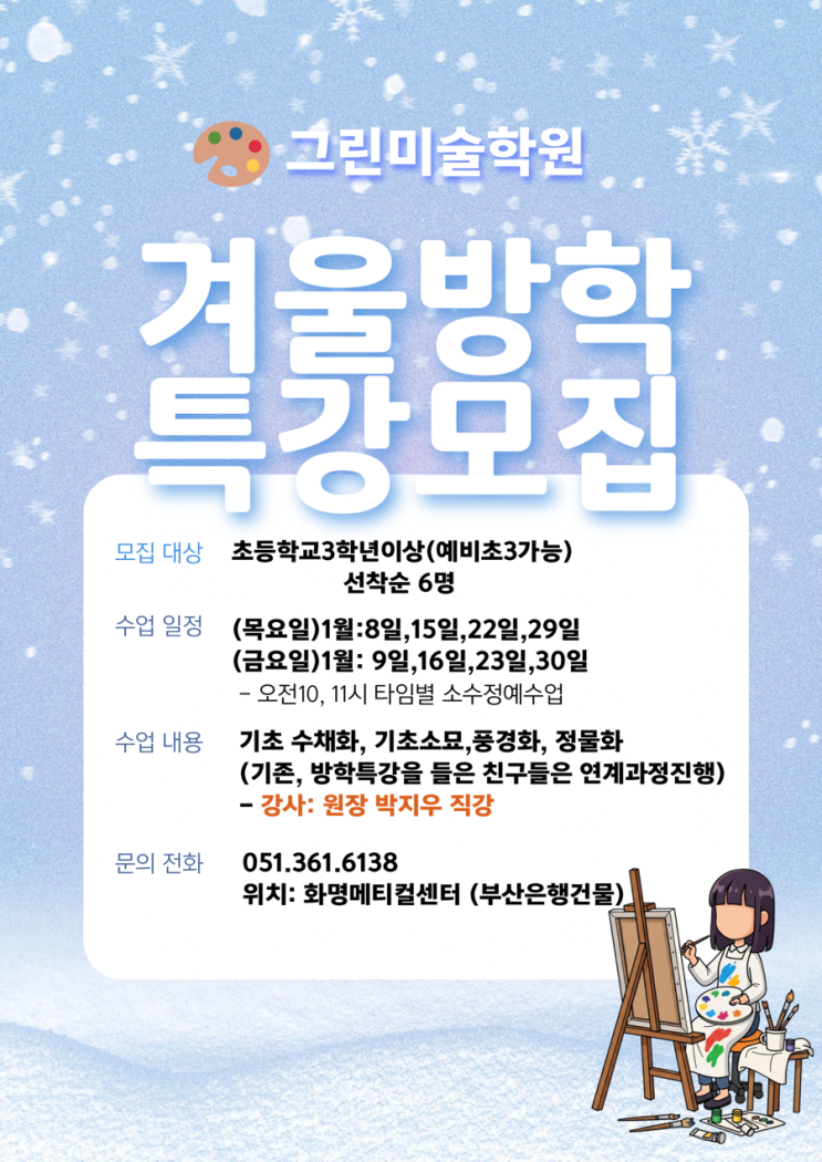 그린미술 겨울방학특강이 오픈되었습니다~~!!! 회화집중반 (목,금)각 타임별 6명 선착순입니다! 퀄리티 있는 수업을 하기 위한 선착순제한이라 양해부탁드립니다. 많은 문의 부탁드립미다 문의: 그린미술학원 051.361.6138 상담 문의는 꼭 전화 문의 후 상담 일정 부탁드릴께요 수업중에는 상담이 어려운점 양해 부탁드립니다 ❤️ 인물도 애교도 센스도 1등 너희가 좋으면 나도좋아 화명동 부산은행건물 6층 (화명메티컬센터) ☎️051.361.6138 화명동미술학원 #부산미술학원 #화명미술 #취미미술 #입시미술 #성인미술 #미술영재 #초등미술 #중등미술#예고입시미술학원#수채화#추위#폭설주의#겨울방학수채화특강#겨울방학....... <img src="https://blogthumb.pstatic.net/MjAyNTEyMTVfMTE1/MDAxNzY1ODAxMzczMzU5.cyuLF2HJpWIskTuQF1UQau6BuD6Xq_WPkI4Gn8EcWY0g.1FWsUWODBLqWCa08TbCIuDAmBdCJRZTgW9KRm7aPYSYg.PNG/WELCOME_SUMMER_%A3%A8Poster%A3%A9_%A3%AD_4.png?type=s3" />