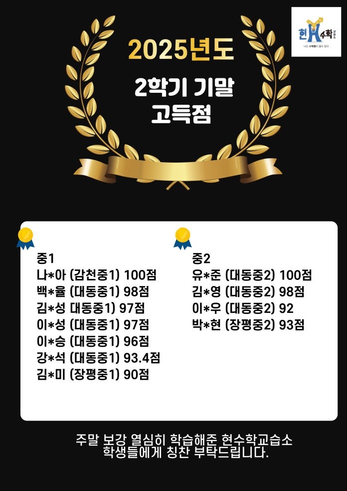 [구평동 중등수학] 현수학교습소2025년 2학기 기말고사 고득점