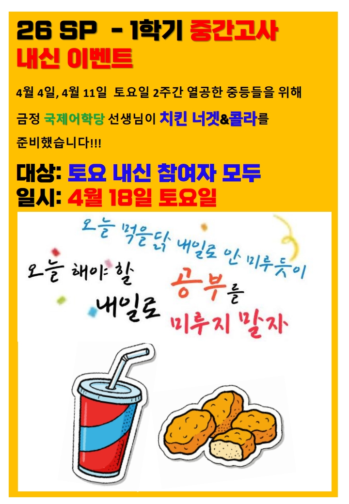 안녕하십니까? 금정구 초등/중등/고등 영어 전문 학원 구서동 영어학원 케이제이 금정 국제어학당 중등부입니다. 꽃이 피고 따뜻해진 봄이지만 중간고사가 딱 기다리고 있어서 마냥 즐거울 수만은 없는 우리 중등들 하지만 [ 피할 수 없으면 즐겨라!!! ] 말해주고 싶습니다. 아직은 일교차가 커서 아픈 친구들이 많습니다. 건강해야 공부도 더 잘 할 수 있으니 건강 + 학습 둘 다 챙겨봅시다. 그래서 준비했습니다!!! 1학기 중간고사 열공하는 중들들을 위한 내신 이벤트 치킨 너겟 & 콜라 맛있게 먹고 힘내서 더 열공해봅시다. 궁금하신 사항은 연락주세요!!! 문의 및 예약: 051) 517-8505 #구서동영어학원 #금정구영어학원 #영어학원....... <img src="https://blogthumb.pstatic.net/MjAyNjA0MDZfNTEg/MDAxNzc1NDU4MTYxNDAz.9oEzeUTyB3xGunfXi9zumxasGpD6GT7mIA7mLHTGv0kg.zW3fqb006Pk0-7XYVLHnOl62iIuViIskWXDJNRqjGbIg.JPEG/26_SP_%C1%DF%B0%A3%B0%ED%BB%E7_%B3%CA%B0%D9_%C0%CC%BA%A5%C6%AE__1.jpg?type=s3" />