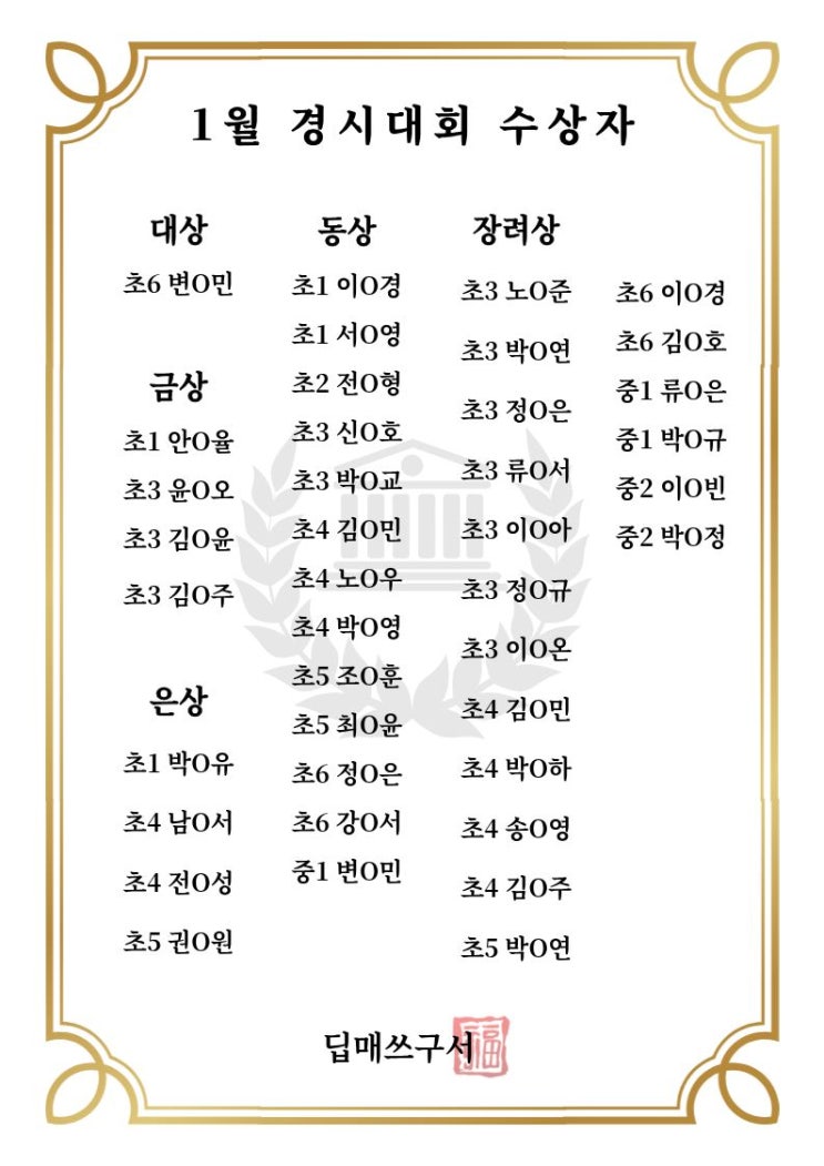 1월에는 6학년 친구가 만점을 받아 대상을 수상했습니다 7세부터 저희 원과 함께 차근차근 학습을 함께 해온 친구가 이루어낸 결과라 더욱 뿌듯한 순간이었답니다 중학교 2학년 2학기 과정을 학습중인 친구라 중1과정의 경시대회도 함께 치뤘는데 중1과정도 동상!!! 현행과 선행 모두 제대로된 학습완성도로 진행되고 있답니다 저희 원에서는 매달 경시대회를 통해 아이들의 학습완성도를 점검해 나가고 있습니다. 2월에도 더 많은 딥매쓰친구들이 도전하고 성과를 이루기를 바라봅니다 #딥매쓰 #구서동수학학원 #초중등수학전문 #서술형수학 #개인별맞춤교재 <img src="https://blogthumb.pstatic.net/MjAyNjAxMzFfMjEg/MDAxNzY5ODY4MDQwMjYx.okFvtqUgnkdqFRJoWeb9XractFHMqVlP4zAQliMyyOEg.p9desSMvoqZKx1N-VvXDRAHav8goiD3yAz-4-PB5Fysg.JPEG/1768260691041.jpg?type=s3" />