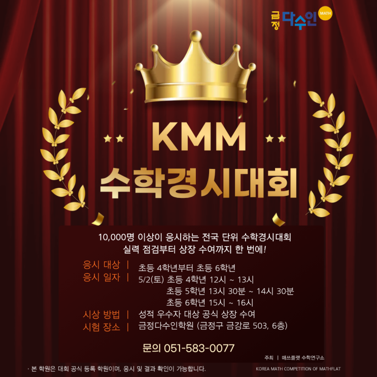 금정구 수학학원, 구서동 수학학원을 찾고 계신 학부모님들께 수학 실력을 점검할 수 있는 좋은 기회를 안내드립니다. 금정대성다수인학원에서 KMM 수학경시대회를 실시합니다. 시험 일정 안내 2025년 5월 2일 (토요일) 초4학년: 12시 ~ 13시 초5학년: 13시30분 ~ 14시30분 초6학년: 15시 ~ 16시 시상 기준 ✔ 대상: 100점 ✔ 금상: 95 ~ 99점 ✔ 은상: 85 ~ 94점 ✔ 동상: 70 ~ 84점 ✔ 장려상: 60 ~ 69점 ※사전예약시 외부생도 참여 가능합니다. ※ 금정다수인학원에서는 학생들이 자신의 실력을 정확히 확인하고 다음 학습 방향을 설정할 수 있도록 경시대회를 운영하고 있습니다. 금정구 수학학원, 구서동 수학학원 금정다수....... <img src="https://blogthumb.pstatic.net/MjAyNjA0MDFfMTQg/MDAxNzc1MDQyMzkzMzQ0.nFUx3PaRjIDu2KRiemKQ1pD7bw6IEYtSCWQhBSUhf8Ag.EVftI0dNB67nxNl__ZS1iUbqxPtg_d2-DTBAXLp0fd4g.PNG/kmm.png?type=s3" />