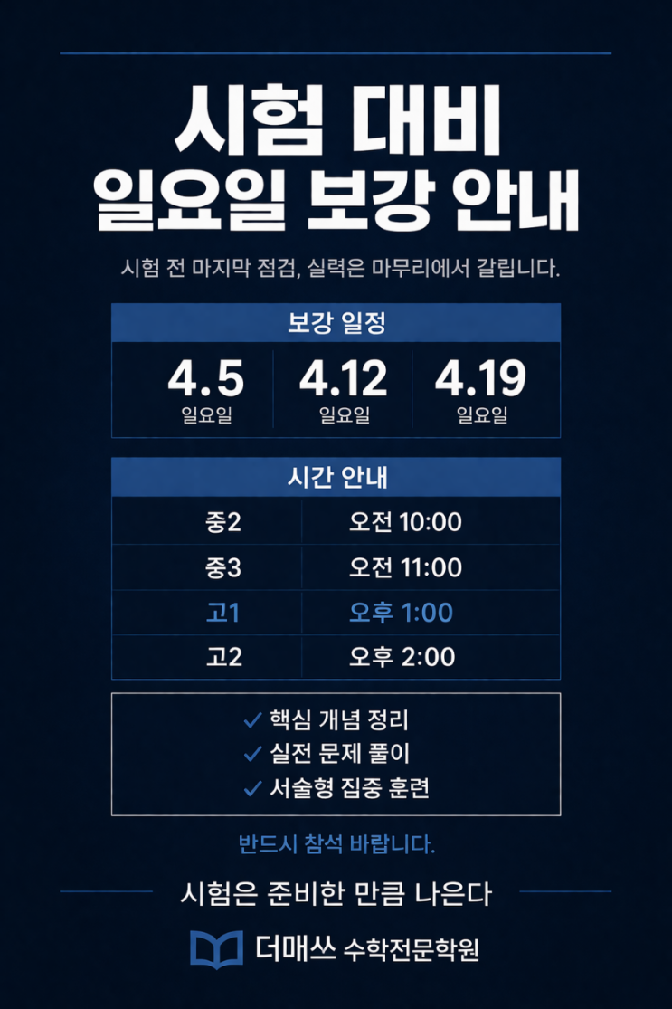 구서지점 4월 시간표 및 사오정 특강 안내 [부산과학내신/금정구사회내신/부산수능대비전문/부산한국사] 안녕하세요 심슨대폭발 과학사회 전문학원 구서지점입니다. 4월은 공부하기 좋은 계절이면서도 수련회, 수학여행 등 다양한 일정과 야외 활동이 많아지면서 자칫 학습이 느슨해질 수 있는 시기입니다. 하지만 4월 말에는 중간고사가 기다리고 있는 만큼 학습의 중심을 잘 잡아야 합니다. 아래 링크에서는 구서지점 학생들이 겨울방학 동안 성실하게 준비해온 모습들을 확인하실 수 있습니다. ⬇ ⬇️ ⬇️ 이번 내신 기간에도 겨울방학 동안 쌓아온 학습을 바탕으로 작년보다 더욱 좋은 결과를 만들어낼 수 있도록 최선을 다하겠습니다....... <img src="https://blogthumb.pstatic.net/MjAyNjAzMjlfMTAy/MDAxNzc0Nzk1NzkwNTE2.YLx2-fOhL-S7KMHwpFeF-urfLdGnPlhY78cObs9aOUYg.3Clpnyov4rOSIbIPUq2cluZB5MIdU92whCtQBkdHTi4g.PNG/image.png?type=s3" />