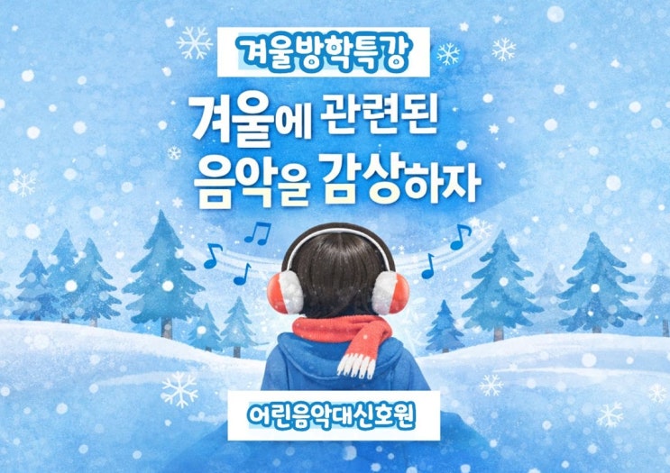 명지 피아노학원의 겨울방학 음악감상 특강 (4주과정) #명지피아노학원 겨울방학을 맞아 명지 피아노학원에선 (음악을) ‘듣는 힘’을 키우는 '음악감상 특강'을 준비했어요. 연주 기술을 잠시 내려놓고, 소리에 집중하며 음악과 친해지는 시간. 귀로 듣고, 마음으로 느끼며, 말로 나누는 과정을 통해, 음악 - 훨씬 더 가까이 다가올 거예요. 이번 특강은 총 4주 과정으로 진행되며, 매주 하나의 주제를 중심으로 다양한 음악을 감상. 어렵게 분석하지 않아요. 대신 아이들의 눈높이에서 느끼고, 떠오른 생각을 편안하게 나누는거죠. “이 음악, 왜 좋지?”라는 질문에 나 스스로 답을 찾아가는 수업. 1주차|겨울의 소리와 분위기 느....... <img src="https://blogthumb.pstatic.net/MjAyNTEyMjJfMjU1/MDAxNzY2Mzg1ODgwMDM4.RYqpqZPsHMDD52pKRFJVdF-TVBJuhIDea7IPZLmvMPAg.JlocJGNK2fbKQ4gEnCQsCRdWFYtEMI0f9V9yLkJRZGsg.JPEG/1.jpg?type=s3" />