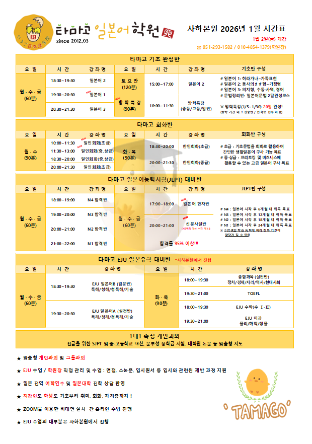 타마고일본어학원에서는 기초부터 회화, JLPT/EJU까지 다양한 과정이 개설되어 있습니다. 정규 수업 외에도 맞춤형 수업과 1:1 개인 과외가 가능하니 수업 시간이나 내용은 자유롭게 조율하실 수 있습니다. ️ 개강일 : 1월2일(금) 사하 본원 부산광역시 사하구 낙동대로 365 3층 ☎️ 051-293-1582(일어빨리) 명지 캠퍼스 부산광역시 강서구 명지오션시티4로 94 명호빌딩 5층 ☎️ 051-294-1582(일어빨리) 12월에도 타마고일본어학원과 함께 頑張りましょうー #타마고일본어학원 #부산일본어학원 #사하일본어 #사하구일본어학원 #명지일본어 #강서구일본어학원 #EJU #일본어기초 #부산일본어공부 #초중고일본어 #성인일본어 #일....... <img src="https://blogthumb.pstatic.net/MjAyNTEyMjJfMjUy/MDAxNzY2Mzc3MzM3NjEz.TQ0pkr9yqn_HC2IespkFFYKTYSjbHTbVScbcnDuwEnEg.sbepBbWsCBfHMEIRN865dzzMMvvAVVn-k9dfZ3AM_Dwg.PNG/%C5%B8%B8%B6%B0%ED_%BD%C3%B0%A3%C7%A5_1%BF%F9%28%BB%E7%C7%CF%29.png?type=s3" />