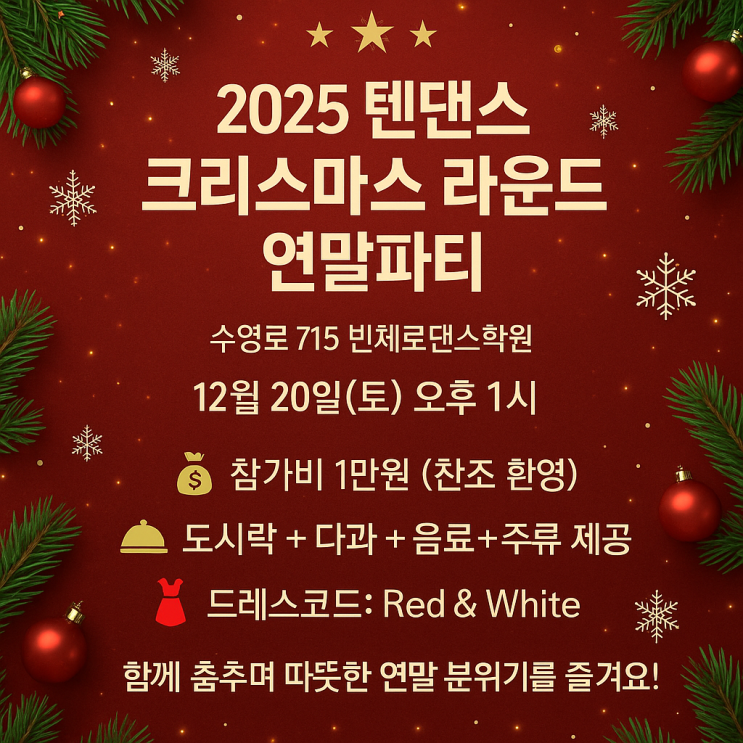 부산 수영구에 위치한 빈체로댄스 VINCERO DANCE에서 댄스를 사랑하는 분들을 위한 댄스 파티를 진행합니다 수업에서 배운 내용을 자유롭게 즐기고, 라틴과 모던의 매력을 함께 나누는 편안한 분위기의 파티입니다. 초보자부터 선수반까지 누구나 부담 없이 참여하실 수 있어요! 파티 안내 일시 : (날짜 / 요일 / 시간 기입) 장소 : 빈체로댄스 부산 수영구 수영로 715, 6층 (수영역 3번 출구 도보 3분) 파티 구성 댄스스포츠 라틴 & 모던 자유 댄스타임 파티 형식의 소셜 댄스 회원 및 동호인 교류 시간 ※ 복장 자유 / 편한 댄스화 추천 ✨ 이런 분들께 추천합니다 ✅ 수업에서 배운 동작을 실전에서 연습하고 싶....... <img src="https://blogthumb.pstatic.net/MjAyNTEyMThfMTgy/MDAxNzY2MDI0ODg0NTA2.6JGDChVdRy10Tx9fudp31jsC0DSVeL4Dw9Y-junv7gIg.2zSinBQm74Rd0DbiydUXOJ7X-TZ2f5aJvcBL-e50Gz4g.PNG/%BF%AC%B8%BB%C6%C4%C6%BC_2025.png?type=s3" />