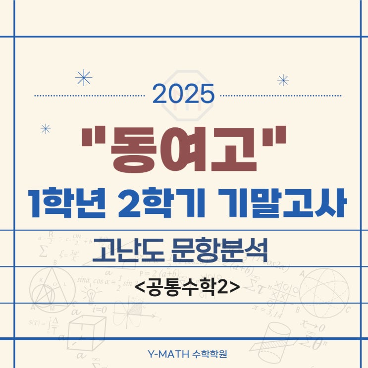 안녕하세요 와이매쓰 수학학원 입니다 이번 동여고 시험은 고난도 문제는 적게 출제 되었으나 중간고사에 비해서는 어렵게 출제되었습니다. 부교재에서 출제된 문제들은 난이도가 낮은 편이었으나 변별력을 요하는 문제가 기출문제였기 때문에 학생들에게는 체감 난이도가 높았을 것으로 예상됩니다. 그럼 지금부터 동여고 공수2 기말고사 고난도 문항을 분석해 보도록 하겠습니다. [ 9번 ] 명제의 부정이 참이 되게 하는 조건을 수식으로 간단하게 나타내고 그 조건을 만족하는 미지수 k의 범위를 세워야 했던 문제였습니다. 두 요소를 풀어나가기가 쉽지 않아 학생들이 시간을 꽤 소요했을 것으로 예상됩니다. 위 문제는 올해 공통수학2가 아닌....... <img src="https://blogthumb.pstatic.net/MjAyNTEyMTlfMTYg/MDAxNzY2MTQxMzgyODg2.ohrnWXW3Y8ums0Fvbl3F6C1mvFaIa5_ARb-5y8Wgbqgg.msXA_wpKCDeMAVl5gZGi3fHiikiKHhSd7lMsMJgBw-Eg.JPEG/%B5%BF%BF%A9%B0%ED_1-2_%B0%F8%BC%F62.jpg?type=s3" />