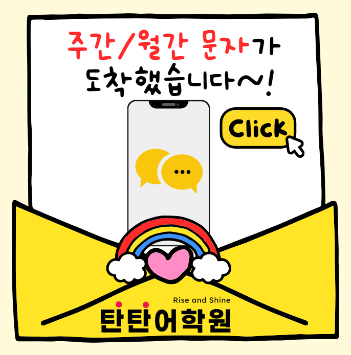 창의적 영어 말하기, 쓰기 중심 어학원 탄탄어학원입니다^^ 탄탄어학원 문자 안내 시스템을 소개해 드리려고 합니다~! 문자 안내가 뭔가요?! ✨ Weekly 문자 (매주 학습 흐름을 바로 확인!) 각 반 담임 선생님이 직접 학부모님 카카O톡으로 개별 전송! * 매주 1회 정기 발송 (반별로 요일은 다를 수 있어요) 공휴일·특별 일정에 따라 일정이 조정될 수 있습니다. . . . ✅ 이런 내용이 담겨요! ✔️ 해당 주 수업 핵심 포인트 ✔️ 과제 수행 및 수업 태도 ✔️ 주간 단어 누적 학습 및 주간 시험 성적 Monthly 문자 (관리의 깊이가 다릅니다!) 역시 담임 선생님이 직접 작성하여 발송! 한 달 학습 내용을 한눈에 정리 ........ <img src="https://blogthumb.pstatic.net/MjAyNjAyMTBfMTc3/MDAxNzcwNjkzMjEyMzU1.WuQJ__uo7s_x5m9Aq5Eo0ct9rh-b4HBj4J7KXb_5l3Yg.ERJL6eovRnCw40NMP7bTzzlCGzrqADX_FoyY34SuarQg.PNG/image.png?type=s3" />