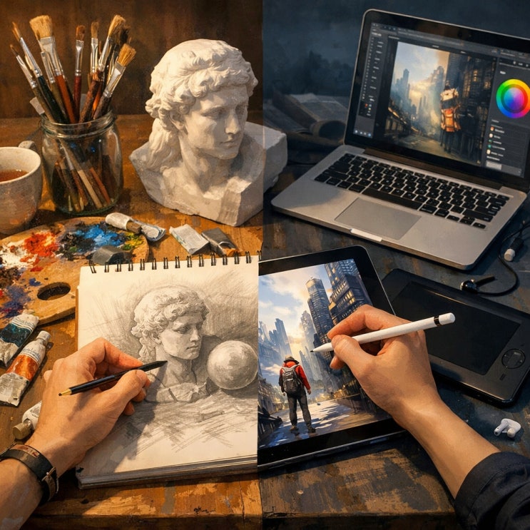 “원장님 전공이 디자인이라면서요? 그런데 왜 수업은 회화 위주인가요?” 처음 상담 오시는 부모님들께 종종 이런 질문을 받습니다. “원장님 전공이 디자인이라면서요? 그런데 왜 수업은 회화 위주인가요?” 그럴 때 저는 이렇게 말씀드립니다. “사실 저도 회화를 먼저 하고, 그 다음에 디자인을 배운 사람이에요.” 그래서 더 확신합니다. 기본기가 튼튼하면, 도구가 바뀌어도 그림의 본질은 절대 바뀌지 않는다는 걸요. 도구는 변해도, 그림의 뿌리는 같습니다 요즘 미술은 정말 빠르게 변합니다. 연필과 붓에서 아이패드로, 종이에서 화면으로, 수작업에서 디지털 작업으로. 하지만 그림의 뿌리는 같습니다. 형태를 정확히 보는 눈. 비례와....... <img src="https://blogthumb.pstatic.net/MjAyNjAyMTBfMjYx/MDAxNzcwNzMwNTMzNTIz.r1BbMNoYn1-vFAkreM6wKD32sUbRxihepbe3u8qUAskg.-YEbEgkhtEv50-m-LOIcLpbA0hPU4QAmyTVHAyldN4Ig.JPEG/KakaoTalk_20260210_223445049.jpg?type=s3" />