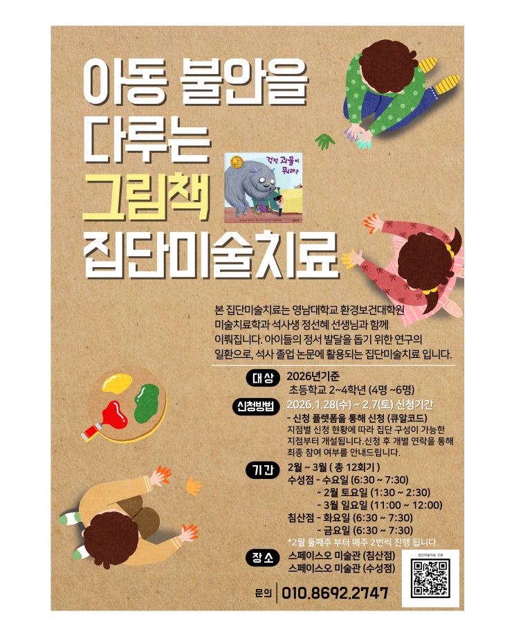 < 아동불안을 다루는 그림책 집단미술치료 모집 > 신청플렛폼 https://forms.gle/rQA9qW4VmF3tkvj36 안녕하세요☺️ 본 집단미술치료는 영남대학교 환경보건대학원 미술치료학과 석사과정 중인 정선혜 선생님과 함께 진행됩니다. 아이들의 정서 발달을 돕기 위한 연구의 일환으로, 석사 졸업 논문에 활용되는 집단미술치료 프로그램입니다. 신학기를 앞두고 설렘과 긴장, 기대와 걱정이 함께 찾아오는 아이들의 마음. 그 마음을 안전한 공간 속에서 천천히 들여다보고 표현해 보는 시간입니다. 아이들이 쉽게 공감할 수 있는 그림책을 매개로 이야기를 나누고, 떠오른 감정과 생각을 미술 활동으로 자연스럽게 풀어내는 집단미술치료로 진....... <img src="https://blogthumb.pstatic.net/MjAyNjAxMjhfMjgz/MDAxNzY5NTk2MjIwNzg2.tdf_9apqm2RyS66mXf12HHUiTd8B5TeG_A5auhXJFOEg.DD2uY6MeF0A-3zcottS94V7k4HC3jyB2xxeyRA4Y2FQg.JPEG/4E5E86F0%A3%ADD3B5%A3%AD4523%A3%ADBE54%A3%ADA9E4B2DBC631.jpg?type=s3" />