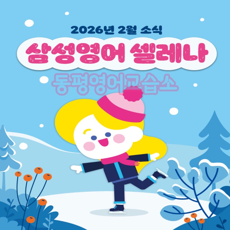 안녕하세요, 삼성영어셀레나 동평영어교습소입니다. 어느덧 2026년의 한달이 지나고 2월이 다가왔네요. 2월 소식 같이 보실까요?? ⬇️⬇️⬇️⬇️ 먼저 2월 전체일정을 살펴볼까요? 일정안내 ⭐2/2개강 ⭐2/27 종강 ❤️2/24 3월 등록❤️ 2/16~2/18 설연휴 휴강합니다. 3일 휴강에 대한 보강은 개별 스케줄을 잡아 진행할 예정이오니 보내드린 안내지를 참고바랍니다. 학습이벤트-숙제삼총사 1월달에 이어서 2월달도 숙제삼총사와 함께 합니다! 추첨 7명을 통해 럭키 간식드려요~ 동평영어교습소는 언제나 활짝 열려 있습니다! 여러분 많.관.부 ⬇️삼성영어셀레나가 궁금하다면?⬇️ ❤️동평교실 더 알아....... <img src="https://blogthumb.pstatic.net/MjAyNjAxMzBfMjAy/MDAxNzY5NzUwMjM5MzAx.mPQlNregVYboSPrXq7PHGDZExeL5R2iVl5QPT0SQAx8g.Tk4jvB0YMrQCEzcgaHdlt7waU02jb0OP6PD_nWS1Y1Ag.JPEG/%C1%A6%B8%F1%C0%BB-%C0%D4%B7%C2%C7%D8%C1%D6%BC%BC%BF%E4_-002.jpg?type=s3" />