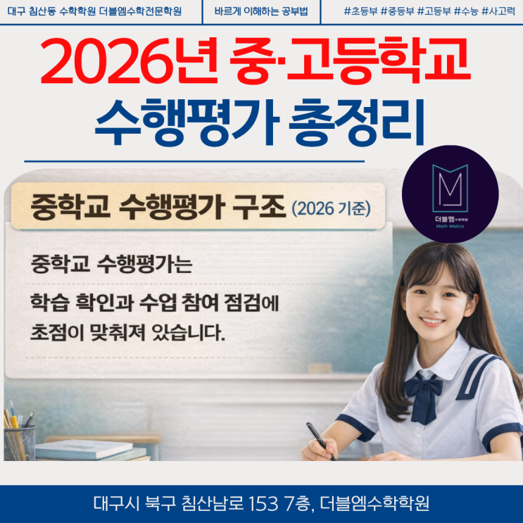 더블엠수학학원 ━ 대구 침산동 더블엠 수학학원 2026년 중·고등학교 수행평가 ㆍ2026년 기준 중학교·고등학교 수행평가 시작 시기와 구조를 정리했습니다. 중1·고1부터 달라지는 수행평가 방식과 내신 반영 차이를 학부모 관점에서 안내합니다.:) ㆍ 글. 사진 ⓒ mmmath01 중학교와 고등학교에서 실시되는 수행평가는 단순한 과제 평가가 아니라, 학생의 학습 과정과 성취 수준을 종합적으로 확인하기 위한 공식 평가 방식입니다. 2026년 기준으로 수행평가는 중학교 1학년 1학기부터 시작되며, 고등학교에서는 내신 성적에 상당한 비중으로 반영됩니다. 그럼에도 불구하고 수행평가의 시작 시기와 운영 구조, 중학교와 고등학교 수행평가의 차....... <img src="https://blogthumb.pstatic.net/MjAyNjAyMDVfMTYz/MDAxNzcwMjU5OTgyOTE3.hN0KRgPTxLWp5PblMUeYtBmZMlRfukMvclR7Mmnp_98g.gTLLBiTvzoI0ZiHYmx8VvbMeoGafL04Jwmu2d2Q9iTQg.PNG/%C1%A6%B8%F1%C0%BB_%C0%D4%B7%C2%C7%D8%C1%D6%BC%BC%BF%E4._%2810%29.png?type=s3" />