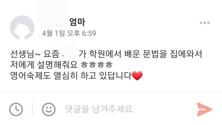 재밌나부다 문법책♡ 신나서 엄마한테 설명해주는 모습이 머리에 그려져서 넘 귀엽다 ㅋㅋ♡♡ 잉톡에서는 아무리 빨라도 초4 이후부터 문법책을 시작합니다. 사실 문법 용어를 받아들일 수 있는 나이는 최소 초4-5학년입니다.(영어 아니라 우리말도요!, 우리 나라 아이들 뿐 아니라 전 세계 모든 아이들이 그렇습니다.) 많은 학원들이 파닉스를 얼른 떼고, 리딩을 조금 한 후 바로 문법을 시작하다 보니 어제도 고민된다며 초2 어머니께서 연락을 주셨습니다. (“지금 문법 시작하는 게 맞나요?”) 그렇다고 잉톡에서 초4-5 이전에 문법을 안 하고 있는 것이 아닙니다. 바른 문장을 익히도록 하며, 문법을 ‘이미’ 배우고 있습니다. 다만, 쉽고....... <img src="https://blogthumb.pstatic.net/MjAyNjA0MDFfMjQz/MDAxNzc1MDM5MjI3NjMy.9ZeDssqrQWB15G8jGs-4dhoNIDw26cr2QQq743niDu0g.cLygwN-K3z5lbbC5oLnXVGH6ZVtE22jmedT7DWWC_jkg.JPEG/900%A3%DFScreenshot%A3%DF20260401%A3%DF190716%A3%DFKids_Note.jpg?type=s3" />