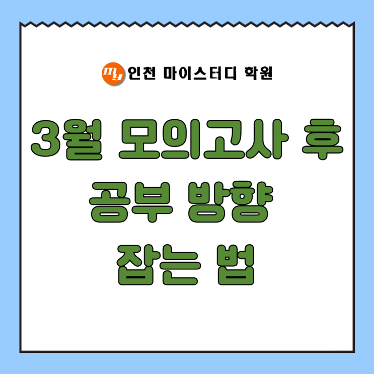 3월 모의고사 후 공부 방향 잡는 법, 지금이 가장 중요합니다 3월 모의고사를 치른 직후, 많은 학생들이 비슷한 생각을 합니다. “생각보다 잘 봤다”, 혹은 “완전히 망했다”… 그런데 중요한 건 점수 자체가 아니라, 이 시험 이후에 어떤 방향으로 공부를 이어가느냐입니다. 같은 점수를 받고도 누군가는 수능에서 크게 오르고, 누군가는 그대로 정체되는 이유는 바로 여기서 갈립니다. 오늘은 3월 모의고사 이후, 꼭 점검해야 할 공부 방향을 정리해보겠습니다. 1. 점수보다 ‘구조’를 먼저 보세요 대부분 학생들은 등급과 점수에만 집중합니다. 하지만 실제로 더 중요한 건 ‘어디에서 틀렸는지’입니다. 예를 들어 국어: 시간 부족인지, 독....... <img src="https://blogthumb.pstatic.net/MjAyNjA0MDJfMzQg/MDAxNzc1MTA2MjEzNDk1.1dA87PfjiASJfNes367Aoe93mRyA00C2NNR0Pj-lfsgg.tk0GtnPyPrrO_BIeLROGhk8qA-gTd5YkKhF_FXgkZtwg.PNG/%C1%A6%B8%F1%C0%BB_%C0%D4%B7%C2%C7%D8%C1%D6%BC%BC%BF%E4._%2829%29.png?type=s3" />