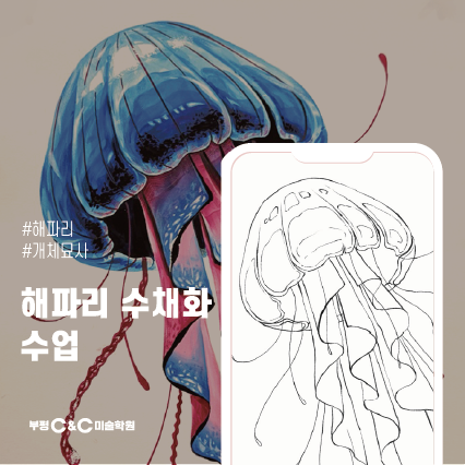 안녕하세요, 부평씨앤씨미술학원 유니쿤 소연T입니다 이번 4월 수업에서는 해파리 수채화 표현 수업을 진행하고 있습니다. 해파리는 형태 자체는 단순하지만 빛의 방향, 명도 차이, 색의 깊이를 함께 표현해야 하는 소재로 기초 표현력을 탄탄하게 쌓기에 좋은 주제입니다. ✔ 수업 방향 이번 수업은 단순한 채색이 아니라 ✔ 물 조절을 통한 명도 단계 이해 ✔ 색을 단계적으로 쌓아가는 채색 방식 ✔ 명도 대비를 통한 입체감 표현 을 중심으로 진행했습니다. ✔ 선생님 시범작 과정 채색에 들어가기 전, 스케치 단계에서 해파리의 형태와 흐름을 먼저 정리합니다. 해파리는 단순한 형태처럼 보이지만 윗부분의 둥근 형태와 촉수의 방향이....... <img src="https://blogthumb.pstatic.net/MjAyNjA0MDJfMzYg/MDAxNzc1MTE0MTg4MTQ2.7xZBzFmj2mxGgeFQsy_F9166oCF154_DIhaIleaSq_Mg.ve83_ibcD55GuEyk6RT8NGjKznV6SD0DCU3rvoT_LCUg.PNG/%B4%EB%C1%F6_23.png?type=s3" />