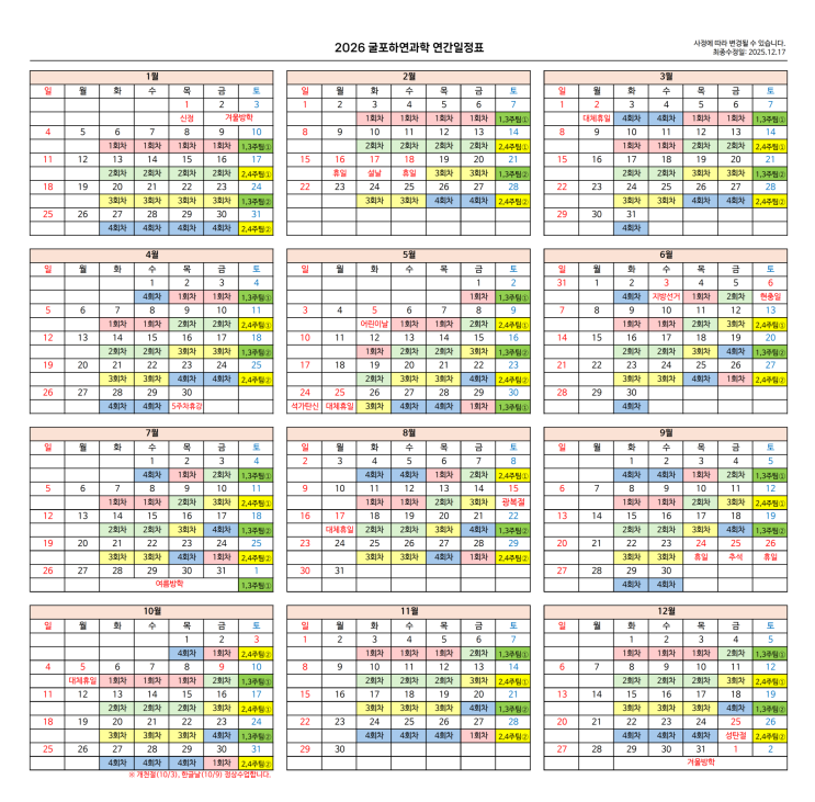 2026 수업일정입니다. 교재 도착일정 등으로 인해 변동이 생길 수도 있습니다. 2026년에도 아이들과 즐겁고 알찬 수업을 이어가도록 최선을 다하겠습니다. 초등 실험수업안내 학년별 팀 수업입니다. 주 1회 1시간씩 <실험+이론+문제풀이+보고서>로 구성됩니다. 4차시로 구성된 하연과학 월 교재를 사용합니다. 1회차 수업에서 실험은 평균 2개로 구성되어 연간 100여 개의 실험을 수행합니다. 보고서는 실험에 소요되는 시간, 아이들의 집중도에 따라 작성 횟수에 차이가 있습니다. 3학년 이상부터는 교과 문제 풀이가 과제로 주어집니다. 실험수업의 진행이 궁금하시면 체험수업이 가능합니다. 문자로 학년/이름 남겨 주세요. 과학실험을....... <img src="https://blogthumb.pstatic.net/MjAyNTEyMTdfMiAg/MDAxNzY1OTgyNTM4NzQ4.bCjRwIGyBEPT3WwdzKg1VEvUJJbKxIcGdKPJLFce_aIg.LpT2ejoR9-YA-1M5AEggytx7YmROaTIAtt8-ctzz9zsg.PNG/%C7%CF%BF%AC%B0%FA%C7%D0_%BF%AC%B0%A3%C0%CF%C1%A4_2026.png?type=s3" />