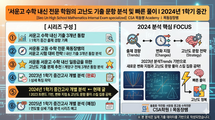 본 게시글은 서운동 서운고 수학 내신 3개년 통합 분석의 후속 작업으로, 연도별 상세 기출 분석 시리즈입니다. [ 시리즈 구성 ] ① 서운고 수학 내신 기출 3개년 통합 | 1학기 중간 출제 경향 기록 ② 서운동 고등 수학 전문 목동장쌤의 서운고 시험 대비 전략 | 내신 기출 3개년 통합 분석 ③ 서운동 서운고 수학 내신 일등급을 위한 고난도 기출 문제 추천 | 계양구 전체 3개년 통합 분석 ④ 2023년 1학기 중간고사 개별 분석 (완료) ⑤ 2024년 1학기 중간고사 개별 분석 ← 현재 글 ⑥ 2025년 1학기 중간고사 개별 분석 (예정) 2023년 분석에서 확인한 출제 경향을 바탕으로, 2024년 시험의 변화 지점과 고난도 문항 풀이 전략을 집중적으로....... <img src="https://blogthumb.pstatic.net/MjAyNjA0MDdfMTY2/MDAxNzc1NDk3NjAwNzI1.0dD9X8KTgD0RvjJRvN3SQXlkhDngQbMOKx-0lx4_2e8g.uVuipTkN2hkq1NX2KuWEMYhSvCoUDgEdXFG_cPNw1xQg.PNG/2024_%BC%AD%BF%EE%B0%ED_%B1%E2%C3%E2_%C7%D8%BC%B3_%BC%D2%B0%B3%B1%DB.png?type=s3" />