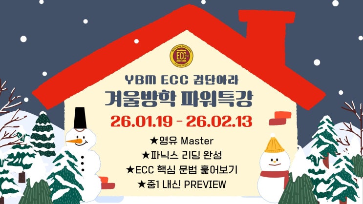 안녕하세요 YBM ECC 검단아라입니다 :) 우리 아이, 이번 겨울방학은 어떻게 준비하면 좋을까요?” 아이의 한 해를 정리하고 새로운 학기를 준비하는 겨울방학은 생각보다 짧고 중요한 시간입니다. 조금만 방향을 잡아주면 아이는 스스로 공부하는 흐름을 만들 수 있고, 학기 중에 느꼈던 아쉬움을 보완하기에도 아주 좋은 시기죠. 겨울방학은 길어 보이지만 실제로는 집중해서 학습 흐름을 잡을 수 있는 소중한 시기입니다. 아이마다 필요한 학습이 다르고, 지금 어떤 과정에 있는지에 따라 겨울방학 동안 어떤 방향으로 준비해야 할지가 달라지기 때문입니다. 그래서 이번 겨울에는 아이의 수준과 학년 변화에 맞춘 영어 기초부터 상위 학년 준....... <img src="https://blogthumb.pstatic.net/MjAyNTEyMDFfMTA1/MDAxNzY0NTc5NzY0ODg4.ZYJh3n0Ueb452JzEk1qomUY0OTtT8T9hFwY9XP4NY28g.6-6fALnb2ex0Ovji7pgVHVpXt8vB_KeVb9Qr9NMyBpMg.JPEG/1.jpg?type=s3" />