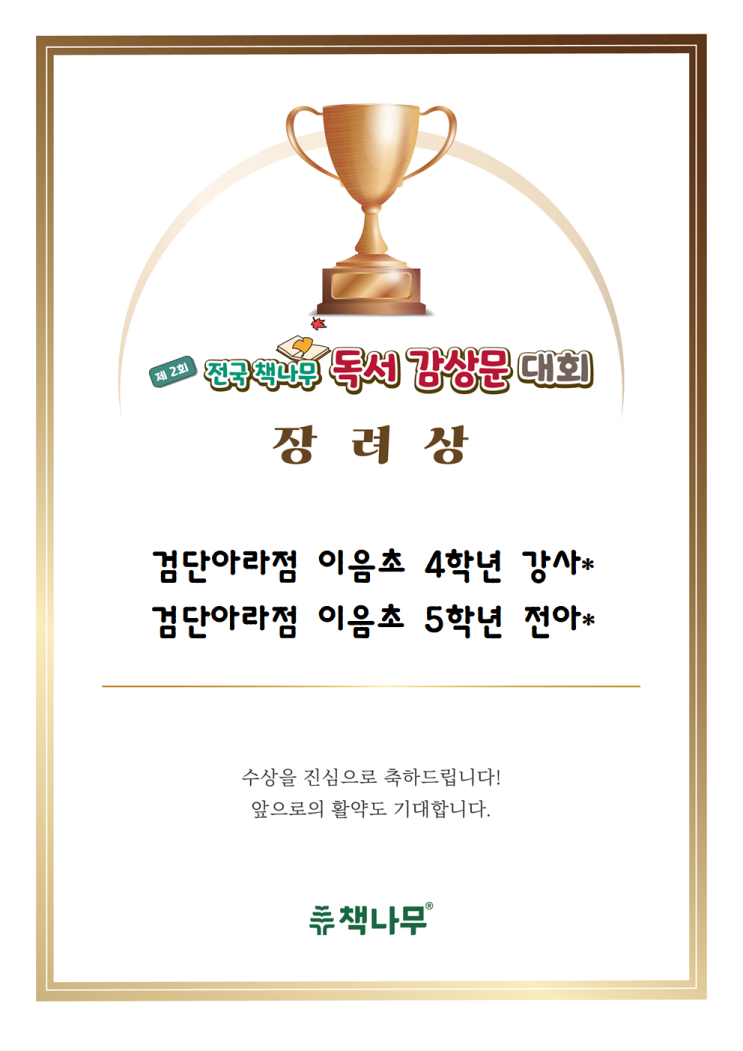 안녕하세요, 책나무 검단아라점입니다. 10월에 열린 제2회 책나무 독서감상문 대회 결과가 발표되었습니다. 이번 대회는 500여 개의 지점에서 약 1,900편이 출품되었고, 총 4차에 걸친 심사 단계 끝에 저희 지점에서 2명의 친구가 장려상을 수상했습니다. 책을 읽고 어떻게 써볼까 고민하며 글을 쓰고, 이야기를 나누며 생각을 키우고, 고쳐쓰기를 반복하며 작품 완성을 위해 노력한 아이들이 참 대견합니다. 이번 대회로 아이들은 책을 읽는 즐거움과 글로 표현하는 성취감을 알게 되었고, 수상 여부와 관계없이 한 걸음 성장할 수 있는 좋은 경험이 되었습니다. 앞으로도 다양한 영역의 독서와 글쓰기 활동을 통해 아이들이 자신의 생각을 자유....... <img src="https://blogthumb.pstatic.net/MjAyNTEyMTBfMTY3/MDAxNzY1MzQ0MDAxMzE5.9ap5EIkN3piNY70J_O3f8OXmiLJzKxlcdiTptIOavf8g.nfeWQDOrVNJwYvtG9ih1X9FDXD155MWFaaZQA942HAkg.PNG/%BC%F6%BB%F3-2001.png?type=s3" />
