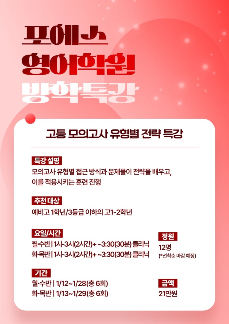 #산본영어 #산본영어학원 #산본고등영어 #중등영어 #고등내신 #영어내신 #흥진고 #수리고 #산본고 #용호고 #군포고 안녕하세요! 포에스 영어학원입니다 날씨가 갑작스레 쌀쌀해졌죠? 어제는 눈이 펑펑 내리기도 했는데요❄️⛄️ 추운 날에 모두 감기 조심하시길 바라요! 포에스 영어학원에서 겨울방학 동안 고등 모의고사 유형별 전략 특강을 진행하게 되었는데요! 예비고 1학년/영어 3등급 이하의 고1-2학년 친구들에게 특히 추천하는 영어 특강입니다! ✔️ 화/목반 • 첫 수업: 1/13(화) 오후 1~3시 (+30분 클리닉) • 정규 수업: 화·목 오후 1~3시 (+30분 클리닉) 여기서 잠깐! “클리닉 시간”이란? 각 학생의 어휘 실력에....... <img src="https://blogthumb.pstatic.net/MjAyNjAxMTNfMTc4/MDAxNzY4MzAxOTIzMTM4.CzrvrB_YoMZl0qdY-xihtl9cF2pRl1qSHm6MDvNhnXEg.TTn3A5LL8D7MgF14jjbVC7NxKv_Sc8mEarUnyAOeECQg.JPEG/IMG%A3%DF4252.jpg?type=s3" />