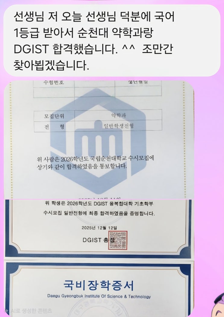 국어 1등급 표준점수 133점 나왔습니다. 과제 한 번 밀리지 않고, 학원에서 가르쳐 준 모든 문제 풀이법을 자기것으로 소화하고 끈질기게 공부한 학생이었습니다. 특히 지문분석은 수능 전날까지도 지문 옆에 빼곡히 빠르게 정리하고도 시간이 10분정도 남았습니다. 국어 공부의 FM인 학생이어서 1등급을 확신한 상태였습니다. 마지막 독서 영역의 초필살기까지 자기 것으로 완벽히 이해하고 수능시험 보러 갔고 예상대로 좋은 결과가 나왔습니다. 순천대 약대 + 디지스트(장학생)+ 한양대 전부 합격했습니다. 약대로 최종 결정했습니다. 나중에 약사되면 이 놈 약국만 찾아가야 되겠습니다. 허허 고생했다!! 꽃길만 걸어라!! <img src="https://blogthumb.pstatic.net/MjAyNTEyMTNfNjYg/MDAxNzY1NjE5NzAyMDA4.xHy_PjEv1d2s1T9WvtS7Rc3PYFNTRrl2xEuCP-EVTEYg.ditav870W8OCUf7xS3RyInRToyLslkJTZr-5-jAl6-Mg.JPEG/%C7%D5%B0%DD%C1%F5111.jpg?type=s3" />