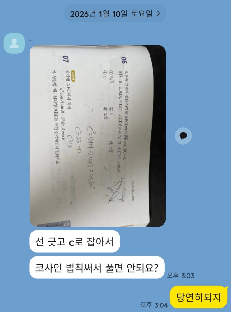 삼각함수를 처음 들어갔어요 크게 숨한번 들이켜고 휘리릭 진도를 나갔어요 삼각함수에서 힘들어 하는 학생들이 제법 있어서.. 이쯤에선 저도 늘 긴장 바짝하거든요. 최대한 빠른 호흡으로. ㅎㅎ 의독적으로 재밌지? 재밌어? 를 몇번이나 해대고는 기어이 ' 오! 재밌어요' 소리를 기어이 얻어내고 말죠. 휴~ 크게 어렵지 않게 넘어가는 모양입니다. 그 와중에 저런 실수! 괜찮아요 점마, 오늘 수업이 없지만 숙제하는중이라고 티 낼라고 그러는거예요. ㅎㅎ 마지막 하트 마무리에 웃습니다~♡ <img src="https://blogthumb.pstatic.net/MjAyNjAxMTBfNDgg/MDAxNzY4MDI1MjM4ODgx.KRA4VAmWGcqgjVsIt3KHD5SA26y0w2OdvHS3fJ88tNYg.7QJ3PY_bZu3GIaZeU4YtZYLh1qrr-__0BtXNYHiDTbkg.JPEG/900%A3%DFScreenshot%A3%DF2026%A3%AD01%A3%AD10%A3%AD15%A3%AD06%A3%AD14%A3%AD603%A3%DFcom.kakao.talk%A3%ADedit.jpg?type=s3" />