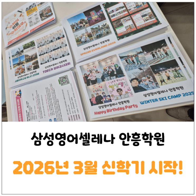 안녕하세요 안흥초 앞에 위치한 삼성영어셀레나 수학여우 안흥학원 원장 Drew 입니다! 벌써 2026년 3월 신학기가 시작되었습니다. 우리 삼성영어셀레나 안흥학원도 역시 학교앞 홍보 준비를 열심히 전략적(?)으로 할아버지 할머니 이모 삼촌 모두 함께 준비하였답니다. (네.. 차 트렁크에 싣고 청령포 갔어요.. 두마리 토끼 모두 포기못해!) 우리학원 학생들과 함께했던 2025년엔 어떤 추억들을 가지고 있을까요? 영어, 수학 실력 Up은 물론, 추억도 가득 쌓이는 우리 삼성영어셀레나 안흥학원의 2025년도 학원생활 자.료.대.방.출!! 하겠습니다. 서울대학교&캐나다 밴쿠버 TOECA 영어경시대회 꿈을 향한 첫걸음! 서울대 캠퍼스 방....... <img src="https://blogthumb.pstatic.net/MjAyNjAzMDVfNjcg/MDAxNzcyNjk0MTYxNTE1.VYmRv86J5lMorLhnvpYqamrVfglAoH9B-V4EFmj1egsg.YhsWbxHB3ATxm3vkokTVueHJ2bVyZQbObvyOd0qwIIgg.PNG/900%A3%DF1772694047640.png?type=s3" />