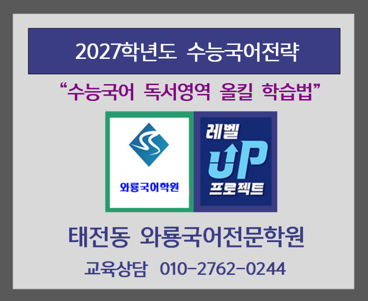 【수능국어 등급을 결정하는 독서영역】 독서영역은 낯선 제시문을 바탕으로 고난이도 문제 위주로 출제되기 때문에 정답률이 문학에 비해 현저하게 낮고 학생들이 기피하는 영역이기도 합니다. 독서영역은 국어에 자신 있는 학생들도 어려워하는 영역이므로 [지문독해법]을 알아야만 1등급에 도전할 수 있습니다. 태전동 국어학원 와룡국어전문학원은 독서영역으로 고민을 하는 학생들에게 이해하기 쉬운 지문독해 학습을 통해서 수능국어 1등급을 견인하고 있습니다. 【와룡학원 독서지문을 이해시키는 수업】 독서영역에서 가장 발목을 잡는 것은 시간이 너무 부족하다는 것입니다. 시간 제한에 모든 신경을 쓰다 보면 압박감 때문에 지문을 이....... <img src="https://blogthumb.pstatic.net/MjAyNjAxMjNfMjYg/MDAxNzY5MTU0MjUwNjk1.Ze2w4Pky6It5O7RVy5r7p3QQYYLmr3idkPBOb8My4n8g.yy6E_c3AKcejcNQBeH1N0KX9MQrnMT51Jtv4wFKRVvgg.PNG/%BF%CD%B7%E6%C7%EC%B5%E5.png?type=s3" />