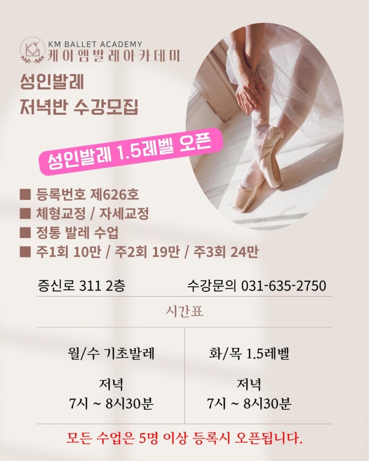 KM발레아카데미 성인발레 수업이 드디어 1.5레벨 수업이 오픈됩니다~ 각 지점 시간표 아래에서 확인바랍니다. 이천점 시간표 KM발레아카데미이천점 성인발레 1.5레벨 오픈 ⏰️월/수 저녁 7시~8시30분 -> 기초발레 ⏰️화/목 저녁 7시~8시30분 -> 1.5 레벨 수업이 끝난 후 연달아 토슈즈 개인 or 소그룹 수업도 가능합니다:) 태전점 시간표 KM발레아카데미태전점 성인발레 1.5레벨 오픈 ⏰️월/수 오후 12시~1시30분 -> 기초발레 ⏰️수/금 저녁 8시~9시30분 -> 기초발레 ⏰️화/목 저녁 8시~9시30분 -> 1.5 레벨 수업이 끝난 후 연달아 토슈즈 개인 or 소그룹 수업도 가능합니다:) ✔️체형교정/자세교정이 필요하신 분....... <img src="https://blogthumb.pstatic.net/MjAyNjAxMjhfMTcz/MDAxNzY5NTgyMzAxOTUx.0weINM0bA3fjDMH-YZIp_WofHSKvR8rrcDkI8wZTFBUg.lO_TX4nfDH6s4cC5tZAMOOCJq9g8BzcK2wsva8BkWeMg.JPEG/900%A3%DF1%A3%DF20260128%A3%DF093311%A3%DF0000.jpg?type=s3" />